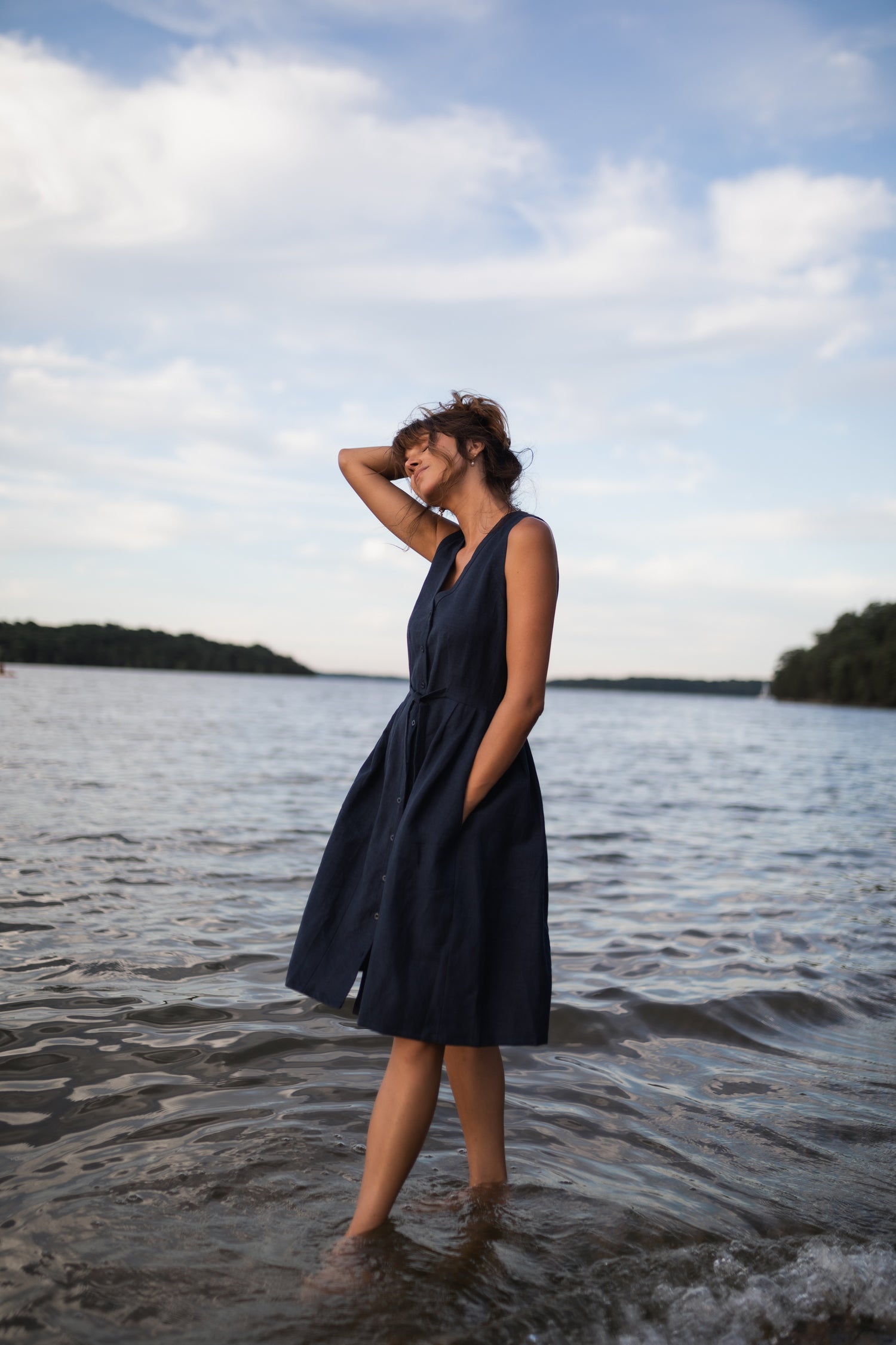 June Dress Sleeveless in Navy Linen - M, L and XL Left
