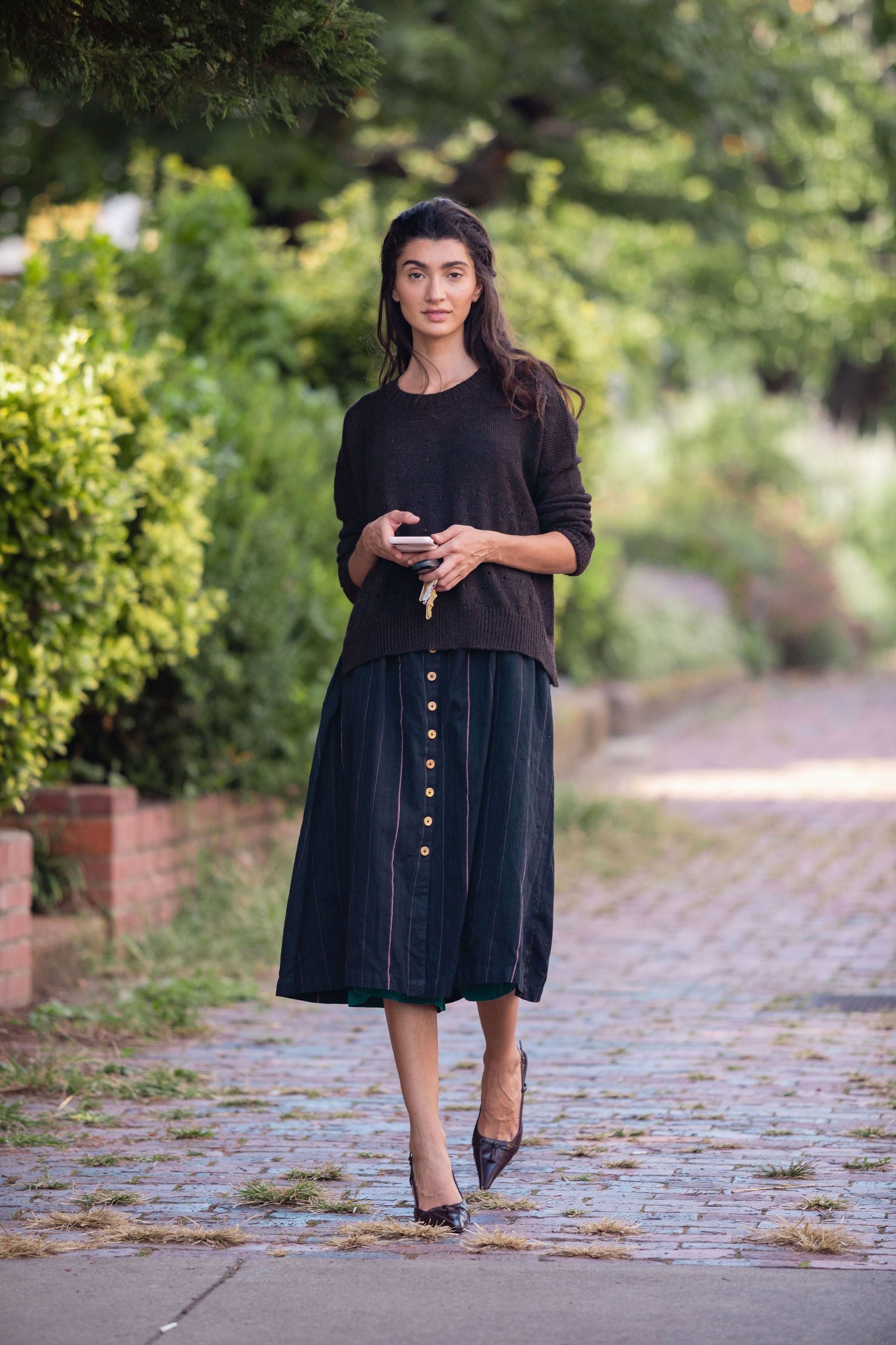 Baby alpaca yarn (meaning the finest grade alpaca from the softest areas of the alpaca's coat). Alpaca is seven times warmer than wool for it's weight and is highly breathable and moisture wicking. This translates to a sweater that is warm in the winter and cool for the summer.