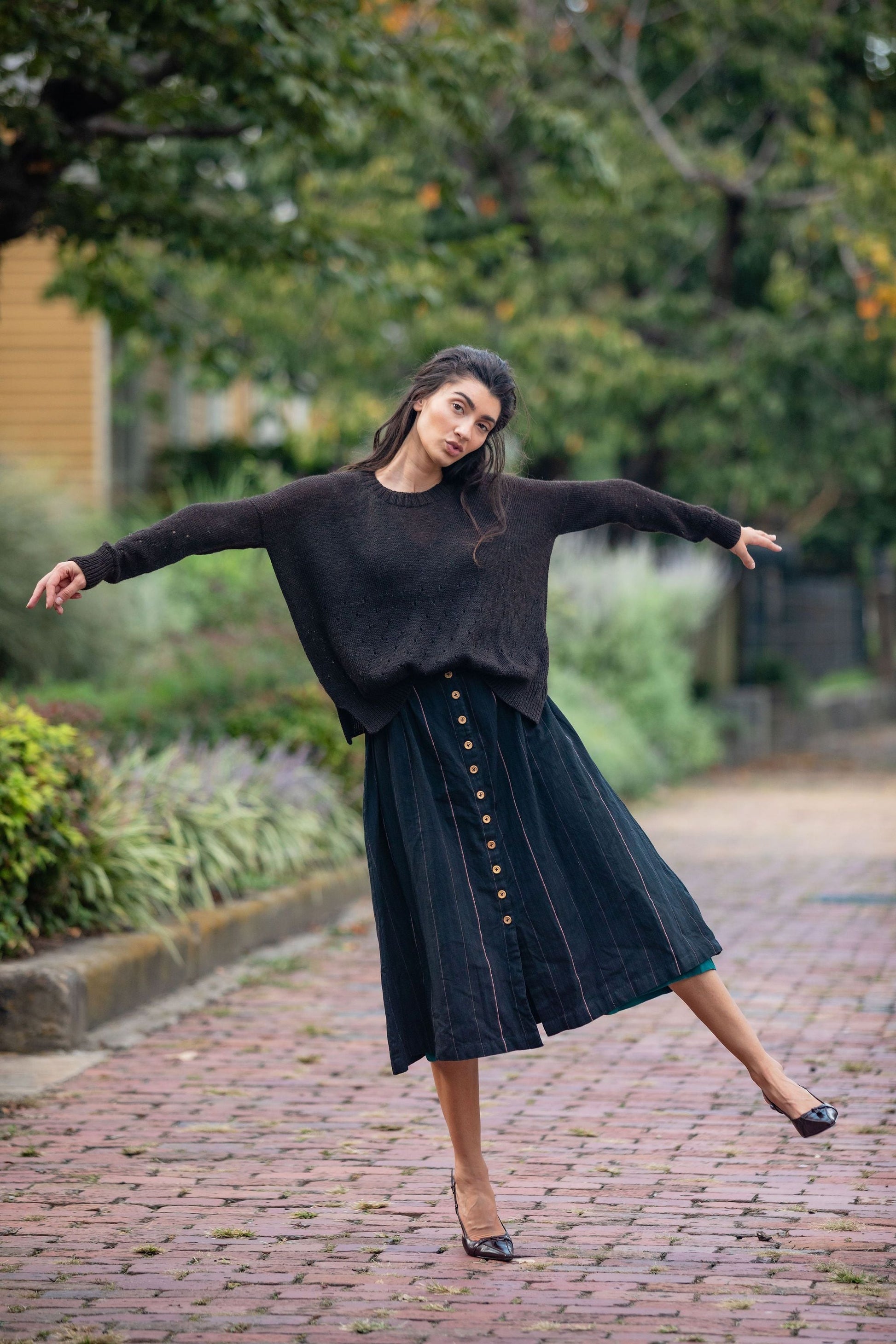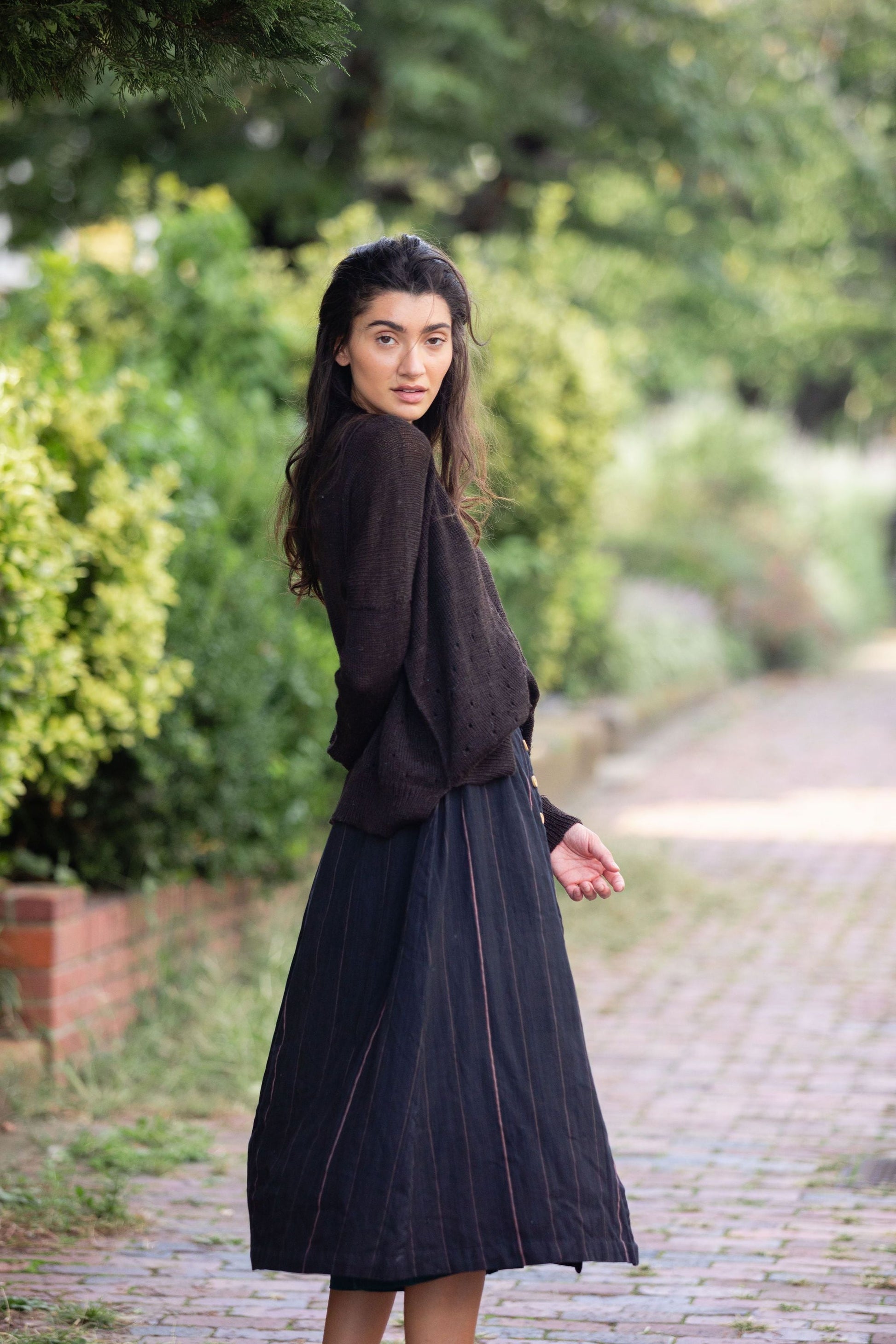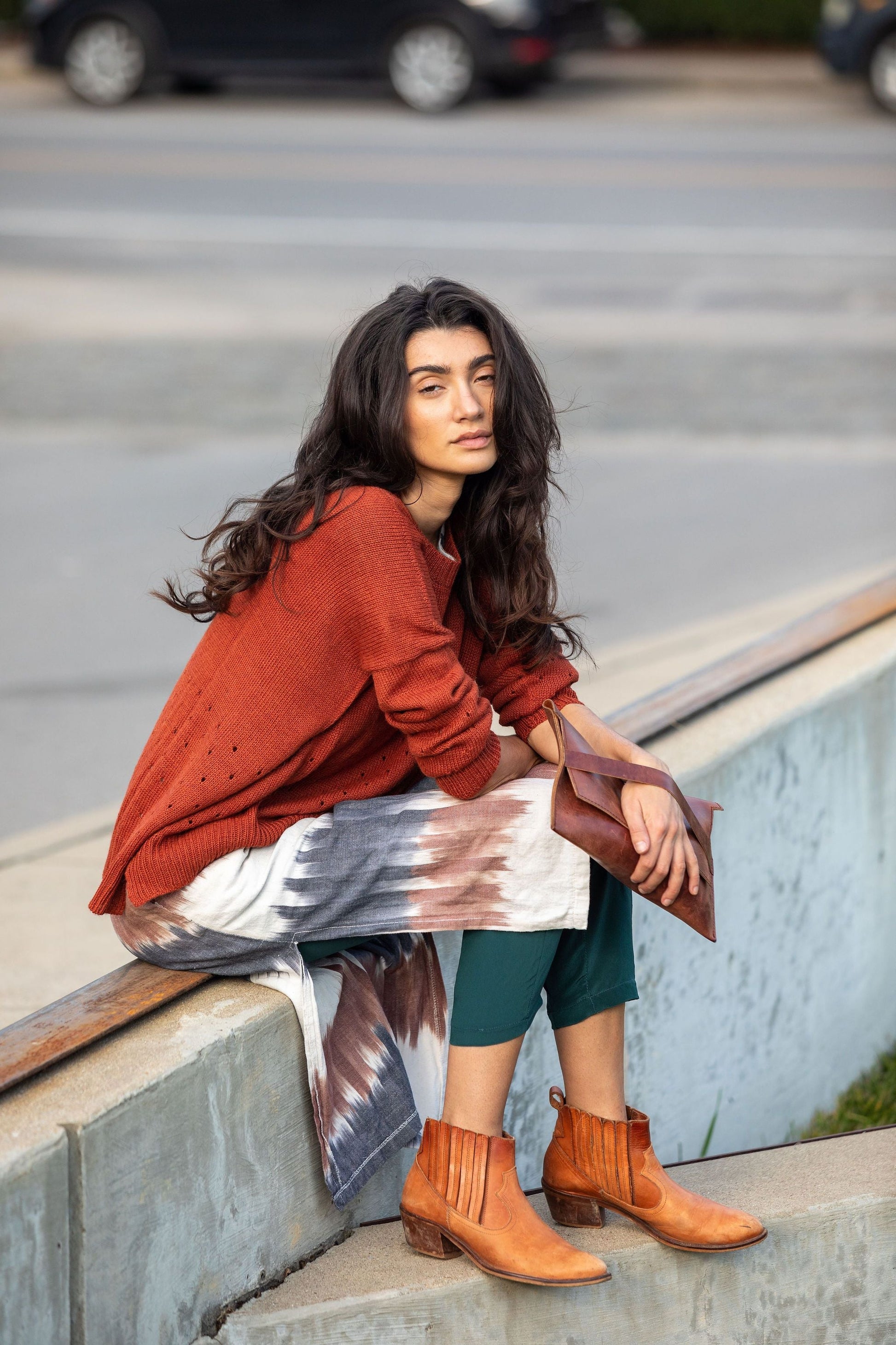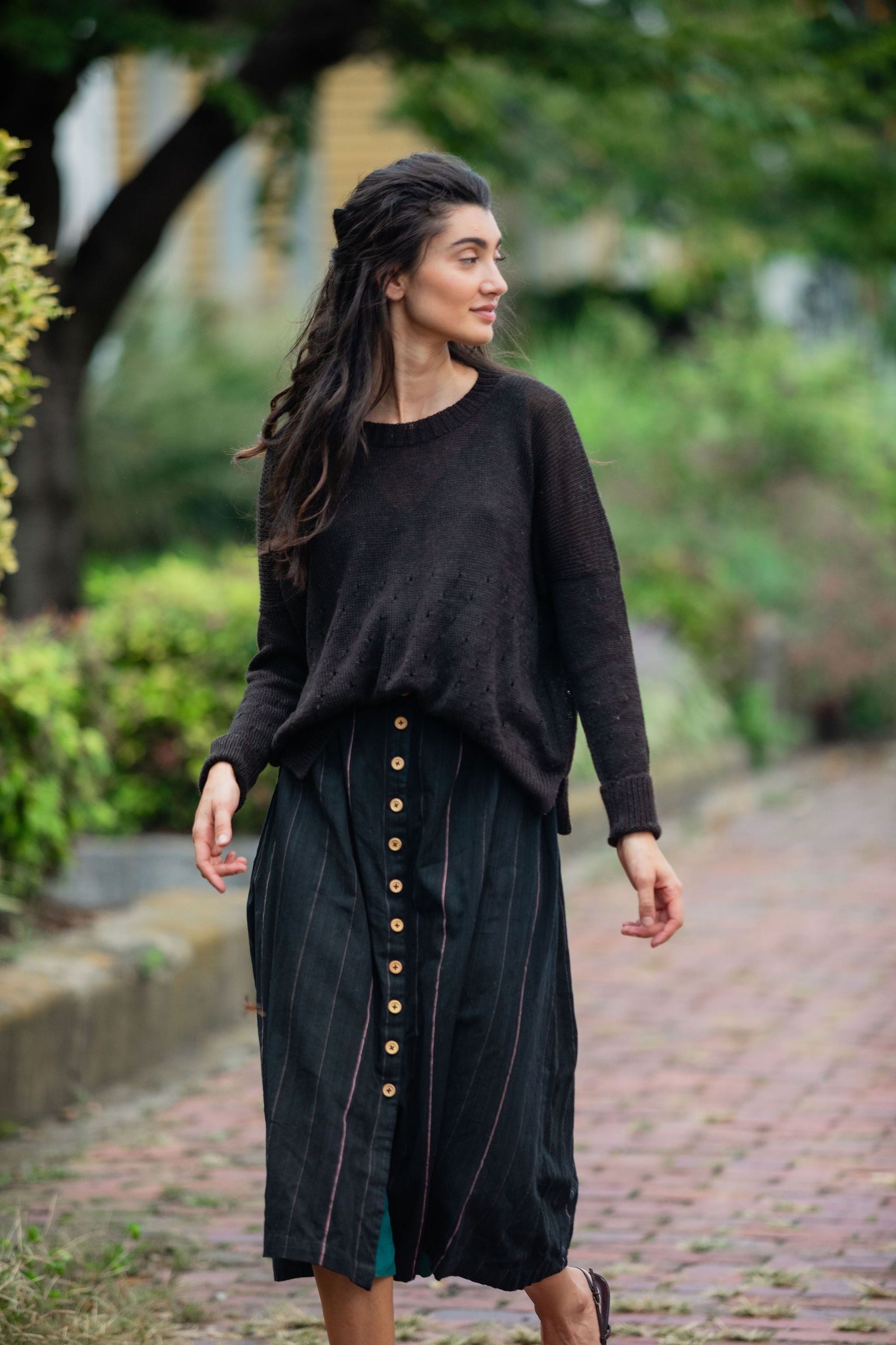 The perfect sweater from early fall to late spring. Comfortable fit, eyelet knit alpaca pullover. Alpaca is super soft and sourced from small farms in the Andes Mountains. Hand knit by a small women's cooperative in Bolivia - giving women an income from their own home.