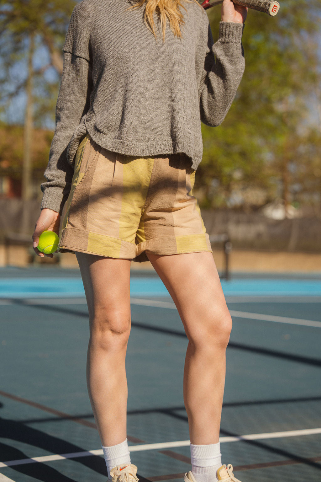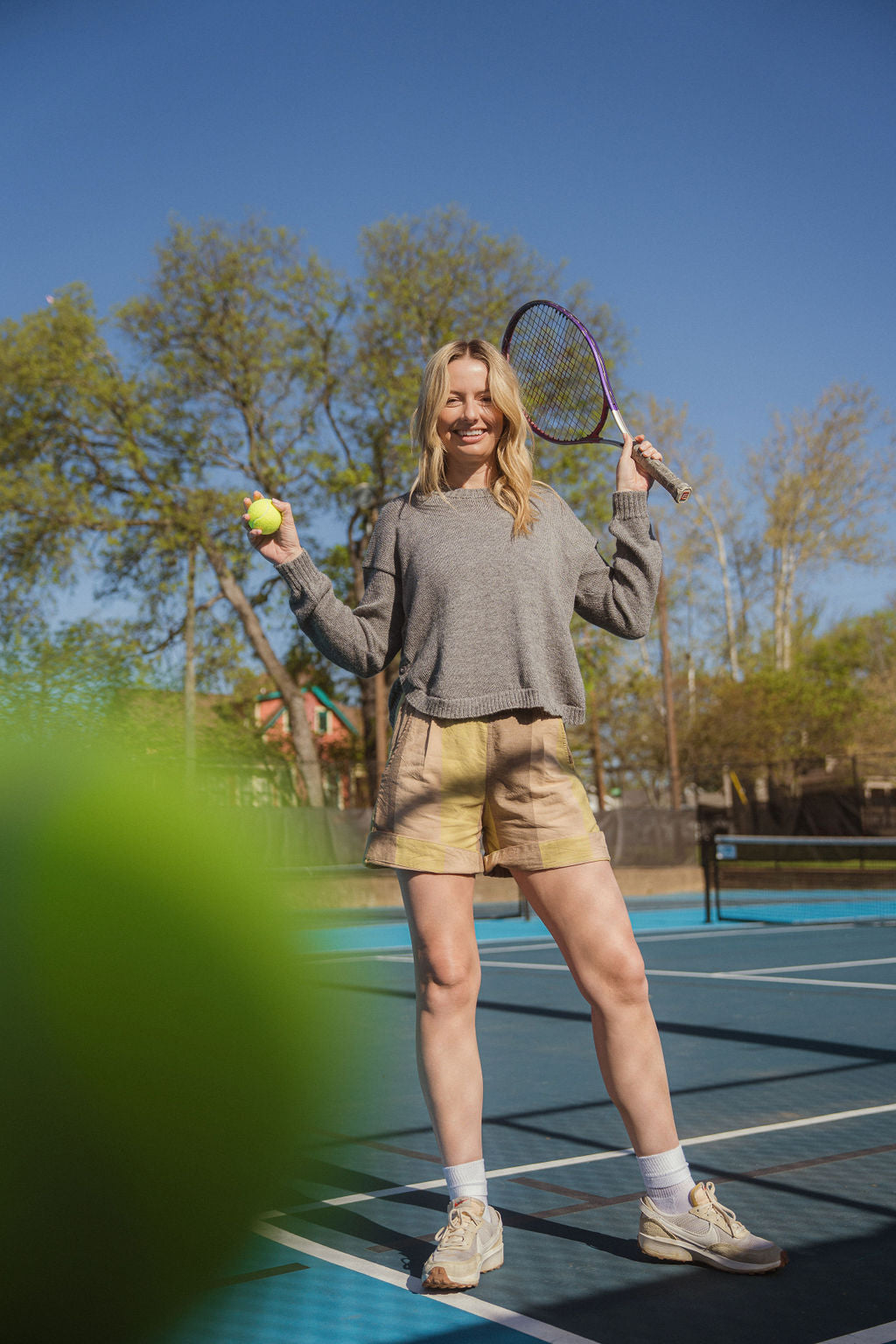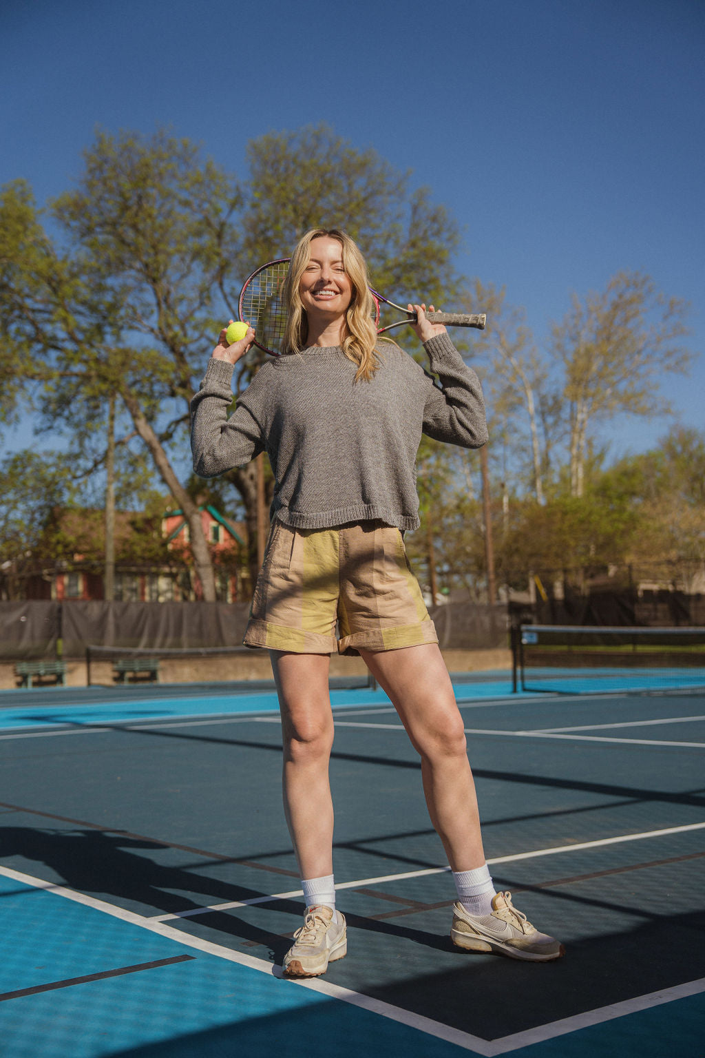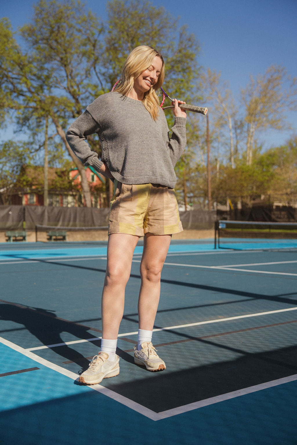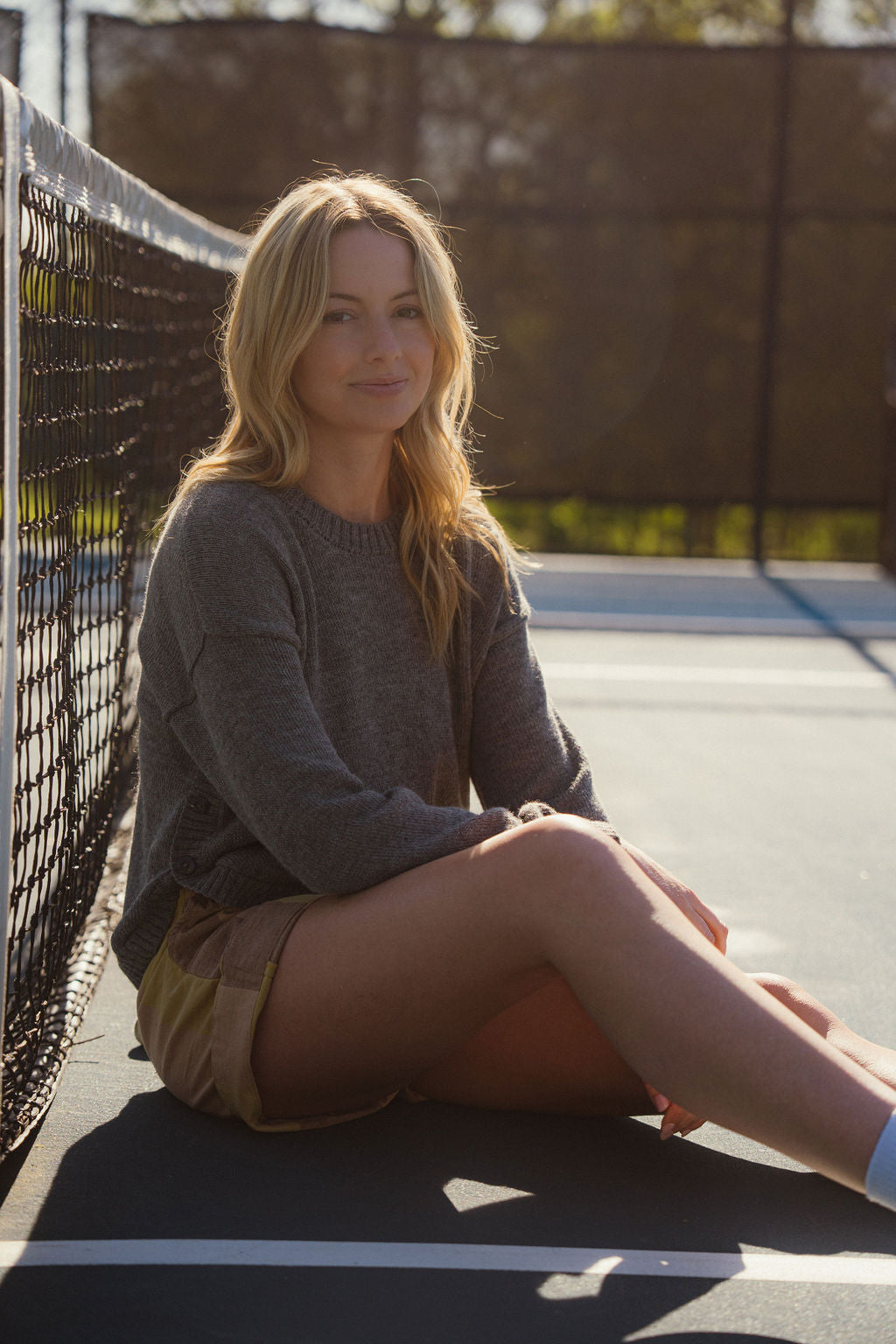 Baby alpaca yarn (meaning the finest grade alpaca from the softest areas of the alpaca's coat). Alpaca is seven times warmer than wool for it's weight AND is highly breathable and moisture wicking. This translates to a sweater that is warm in the winter and cool for the summer.