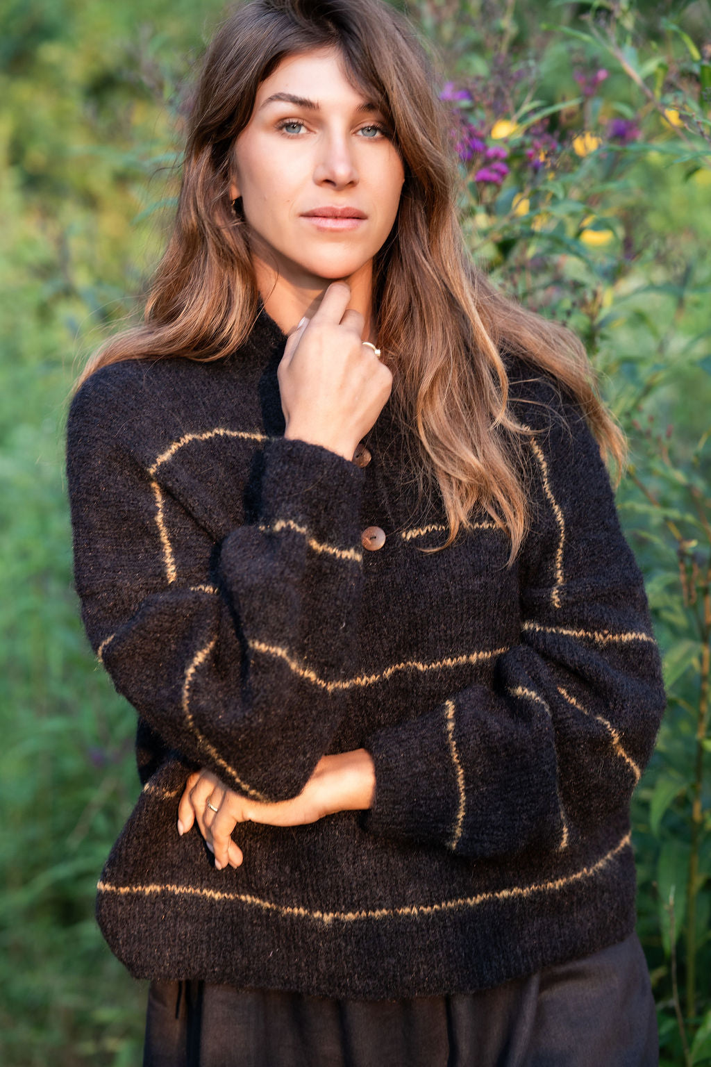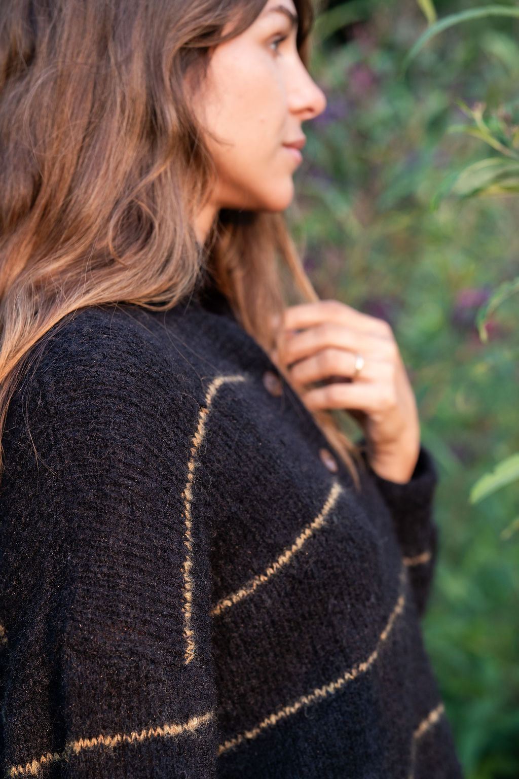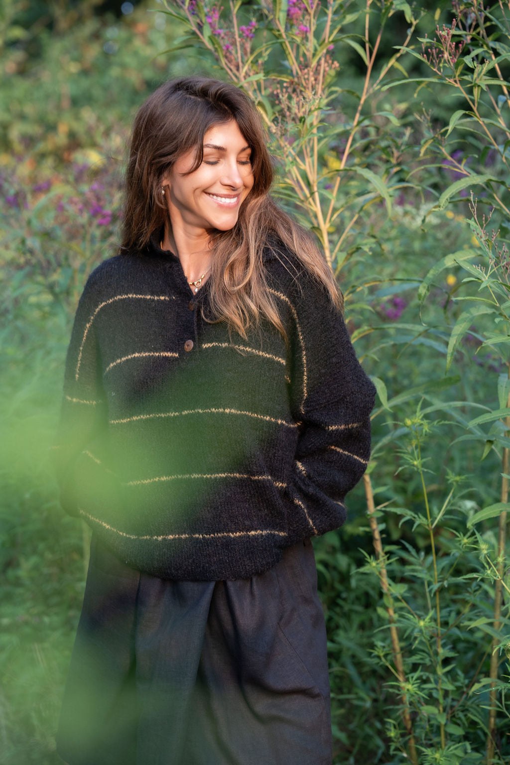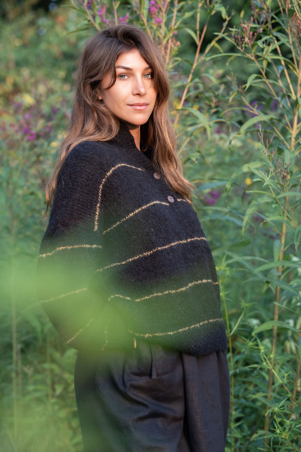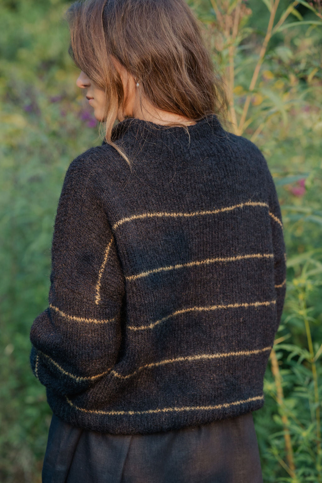 Edith Mohair Pullover Henley Sweater in Black and Moss Stripe Made to Order