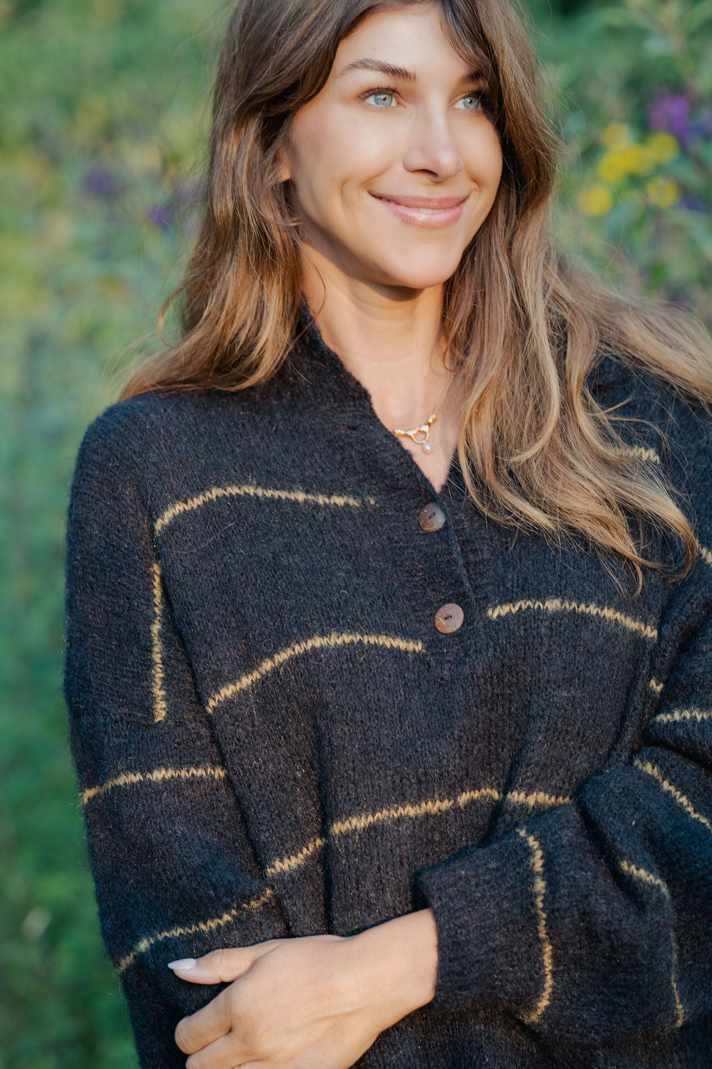Oversized henley style with slightly textured-loose knit.