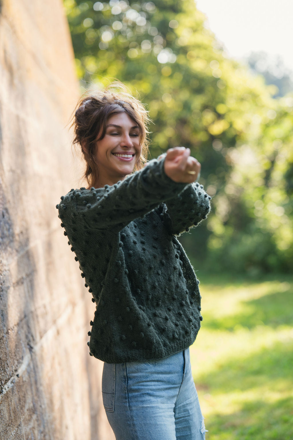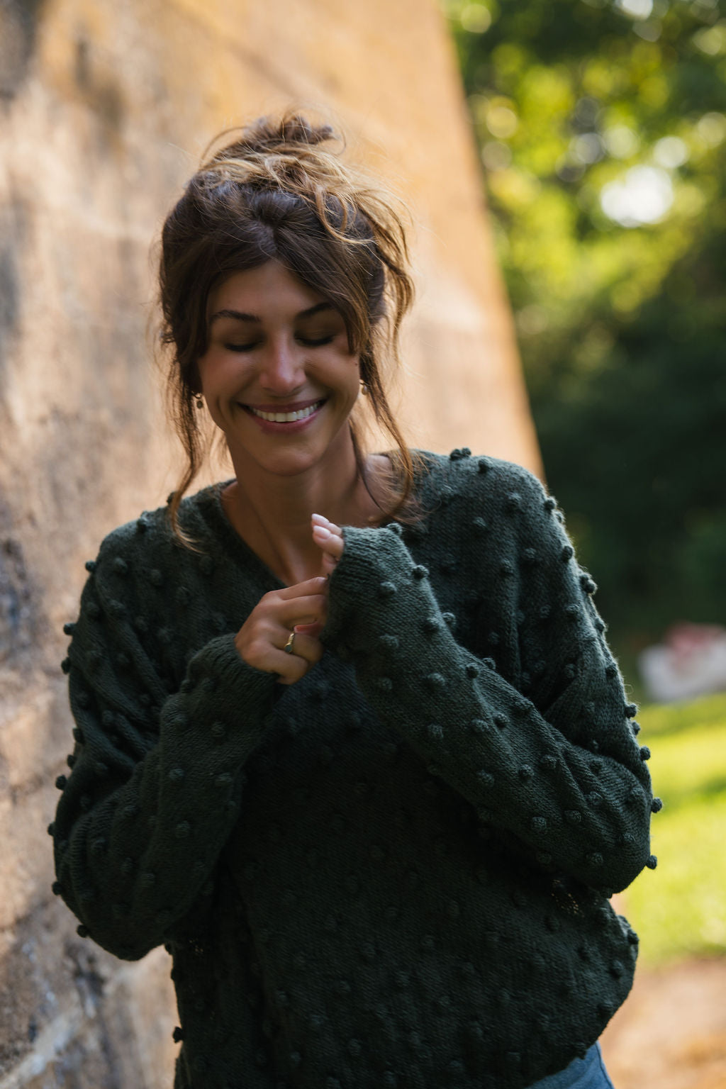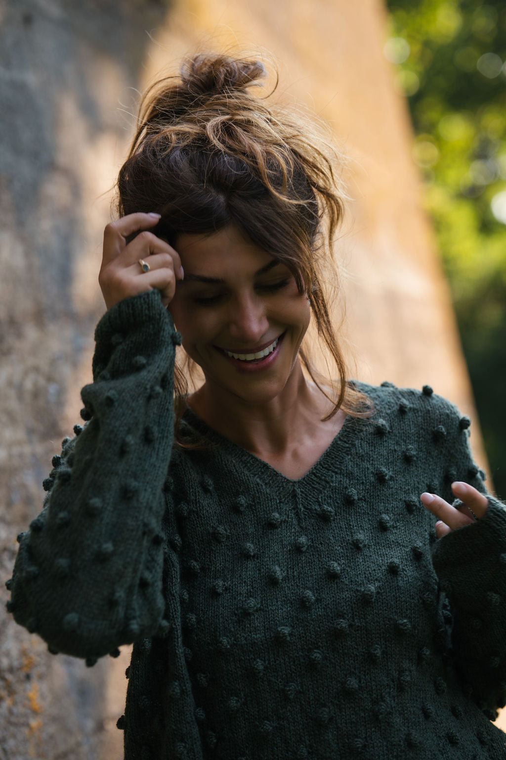 Vintage inspired v-neck with textured knit. Hand dyed, high-quality wool sourced from farms in Nepal then hand knit by a fair trade workshop there.