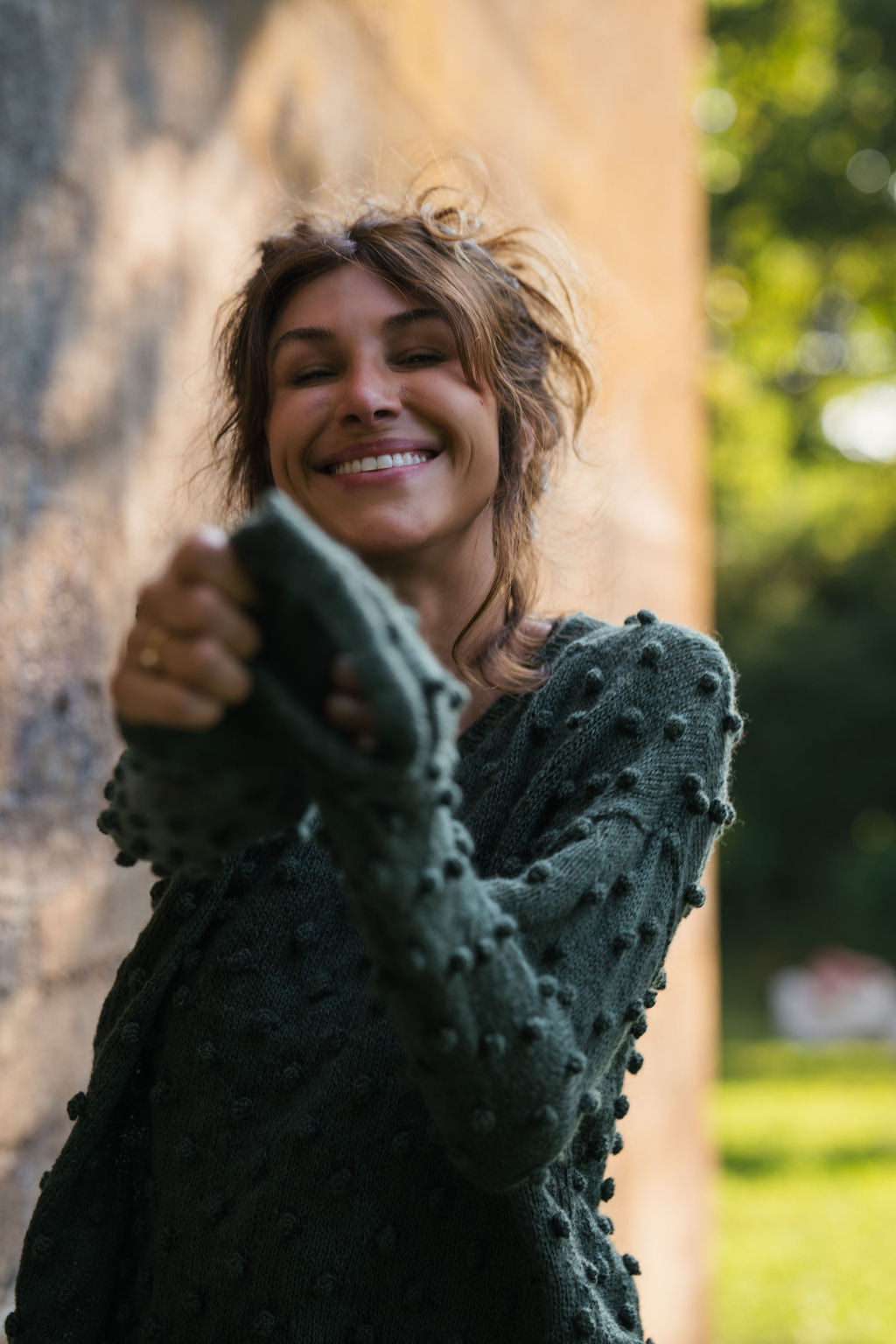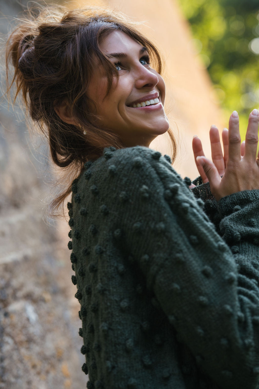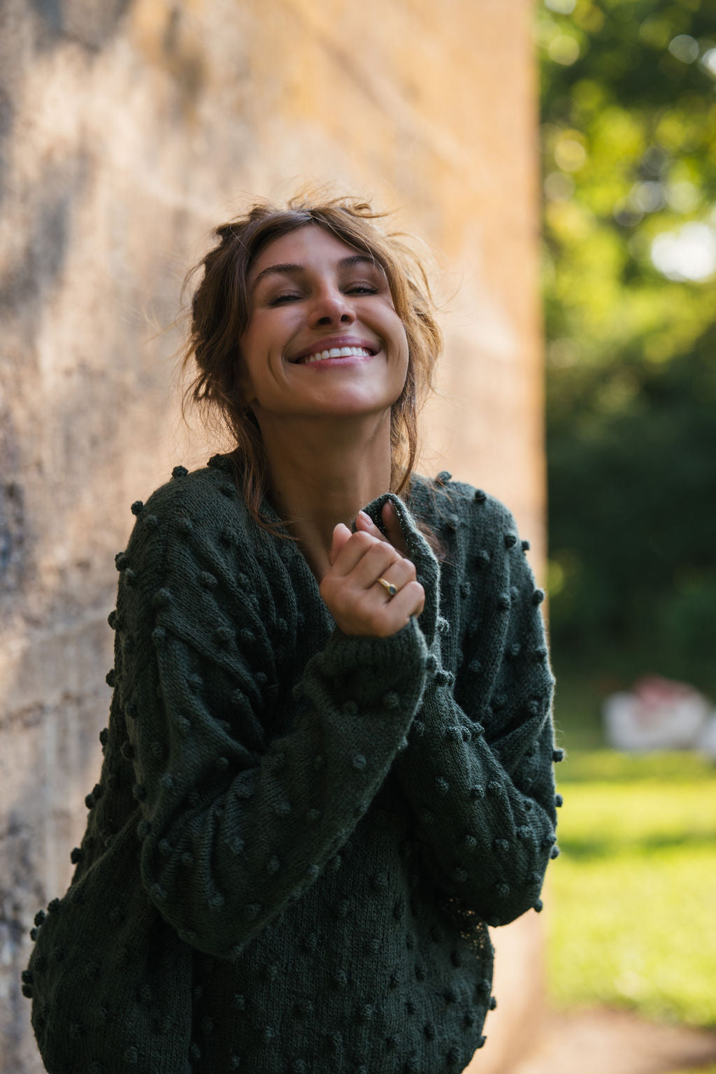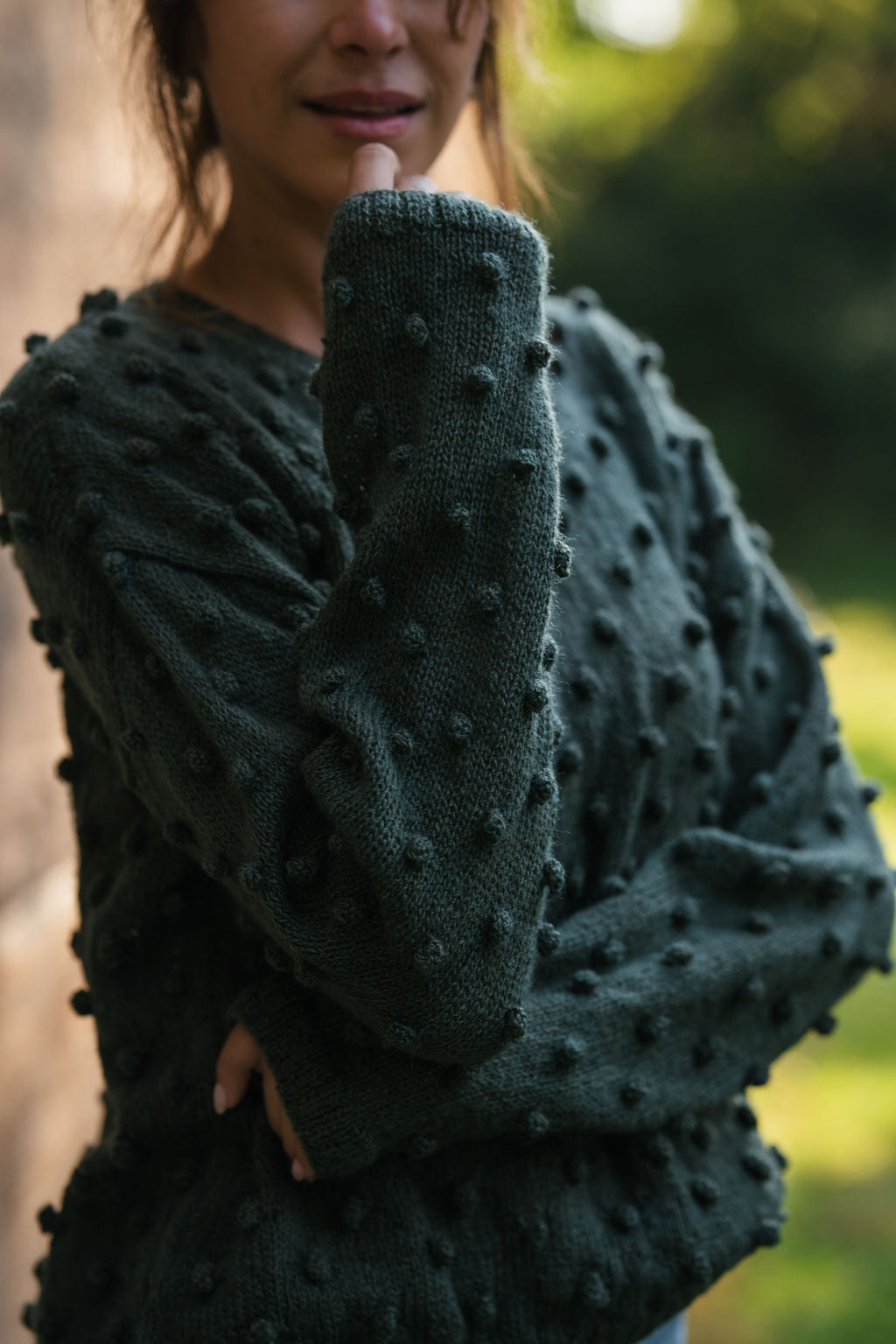 Vintage inspired v-neck with textured knit. Hand dyed, high-quality wool sourced from farms in Nepal then hand knit by a fair trade workshop there.