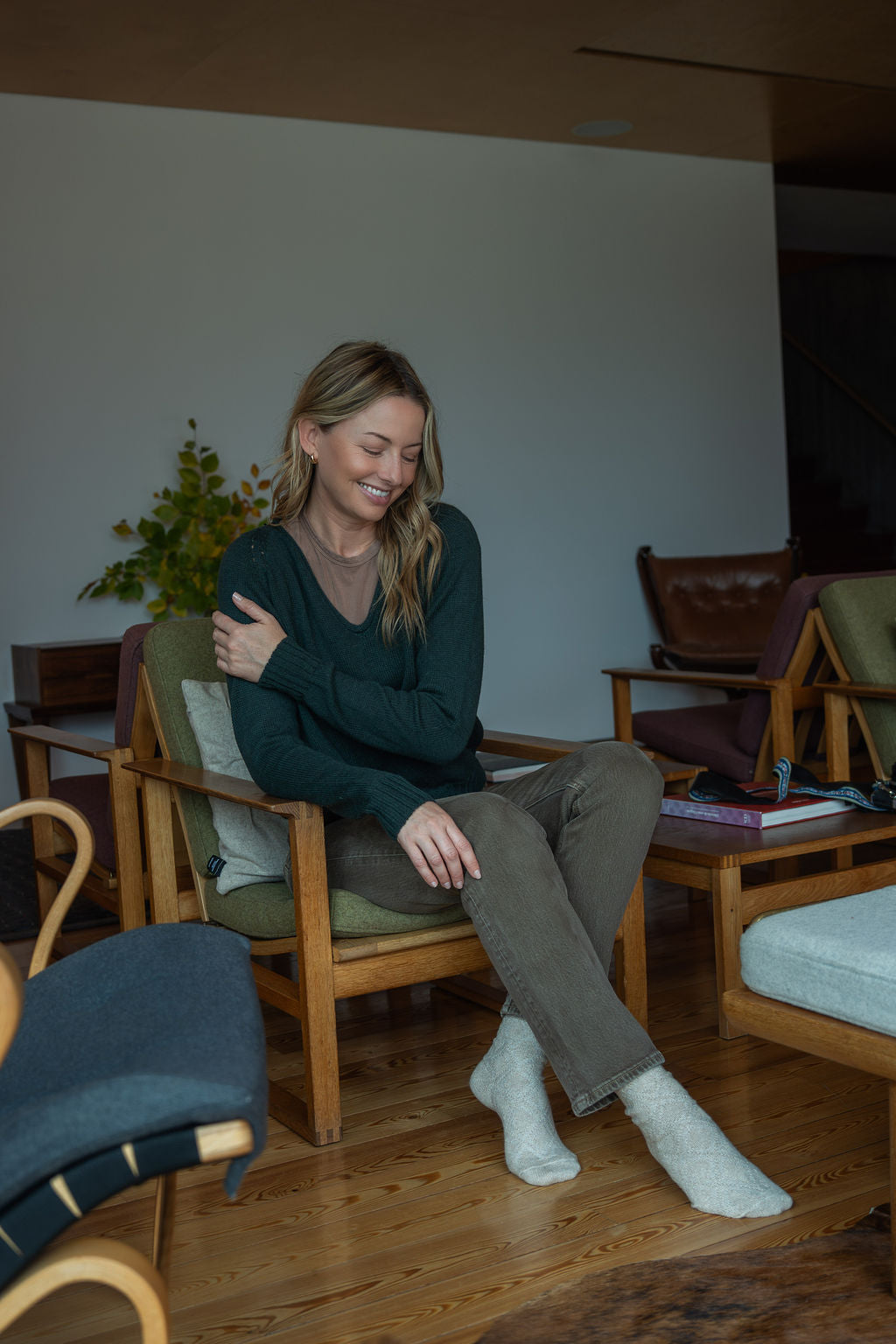 Baby alpaca yarn (meaning the finest grade alpaca from the softest areas of the alpaca's coat). Alpaca is seven times warmer than wool for it's weight and is highly breathable and moisture wicking. This translates to a sweater that is warm in the winter and cool for the summer.