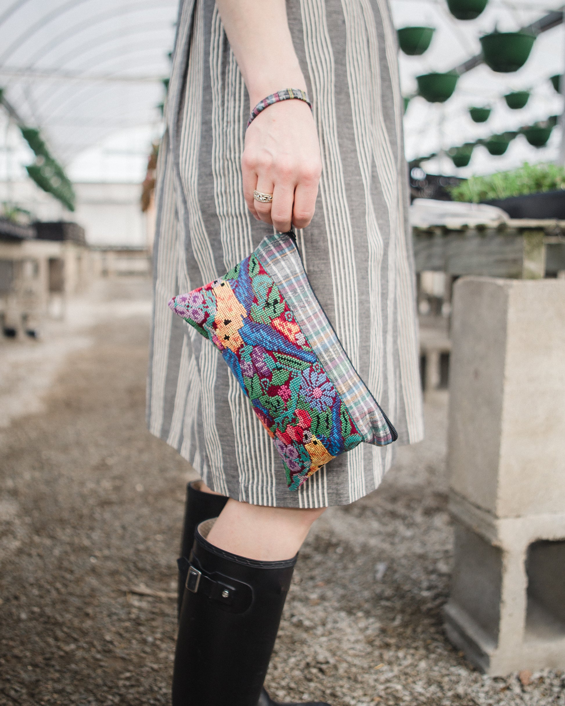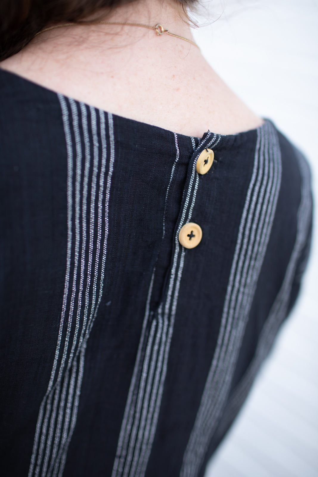 The fabric of this dress is hand-dyed and handwoven by a family that has been weaving high quality textiles for many years. The yarn is dyed, then spun by hand, and then finally handwoven into these stripes. The texture in this piece comes from the dying and weaving process.
