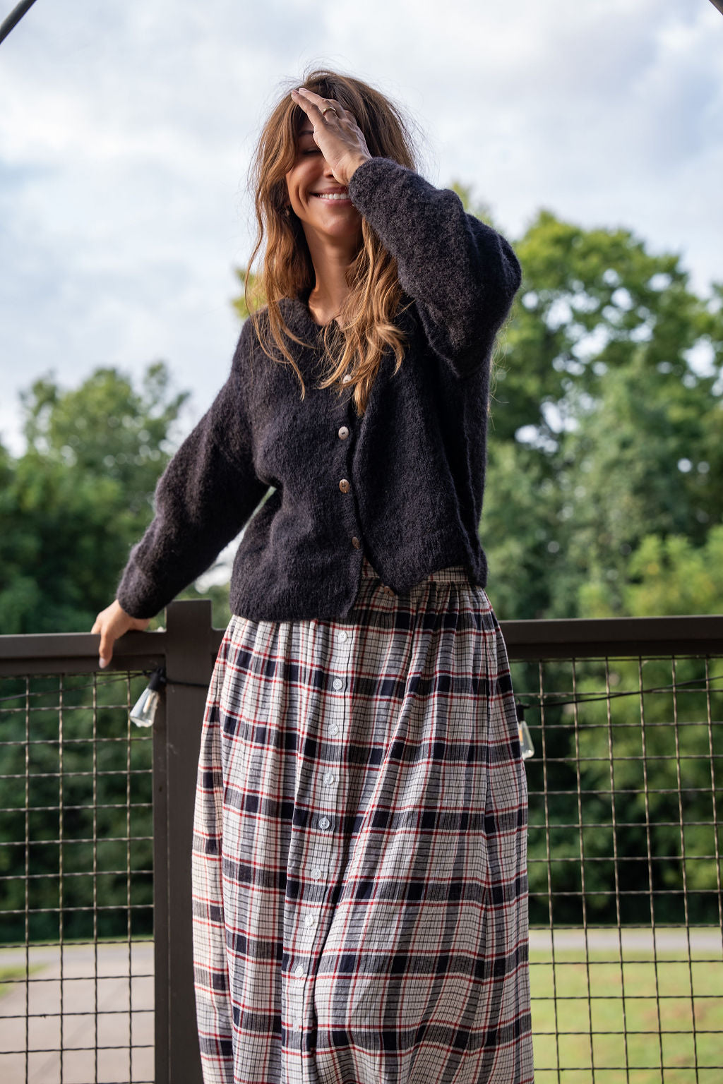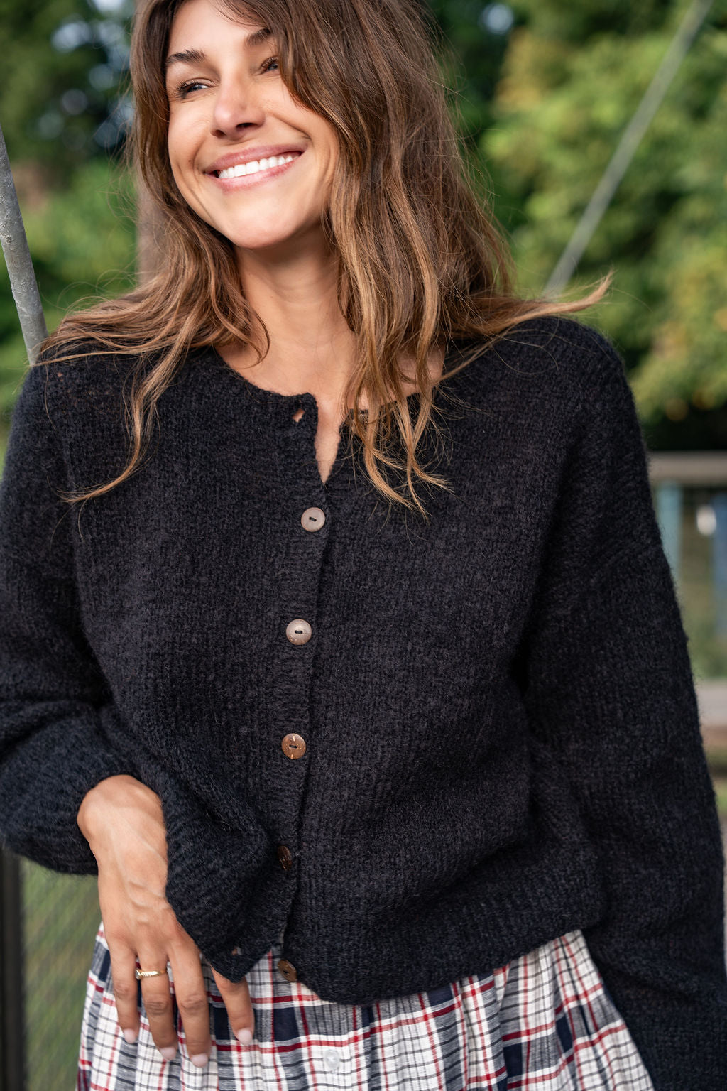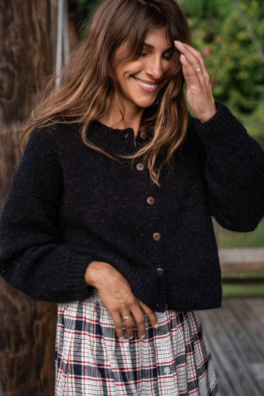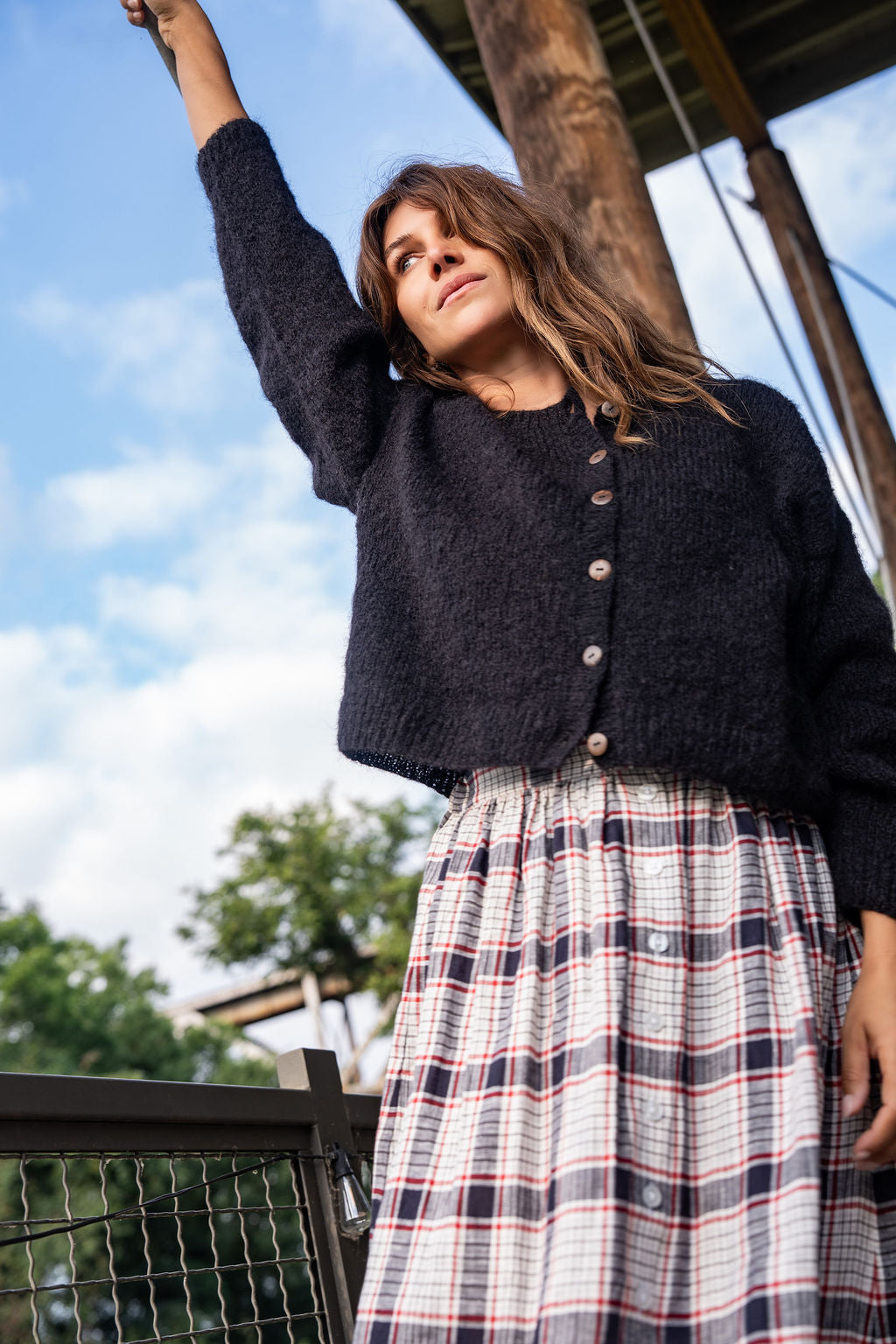 Oversized classic cardigan in a lightweight mohair with coconut buttons.