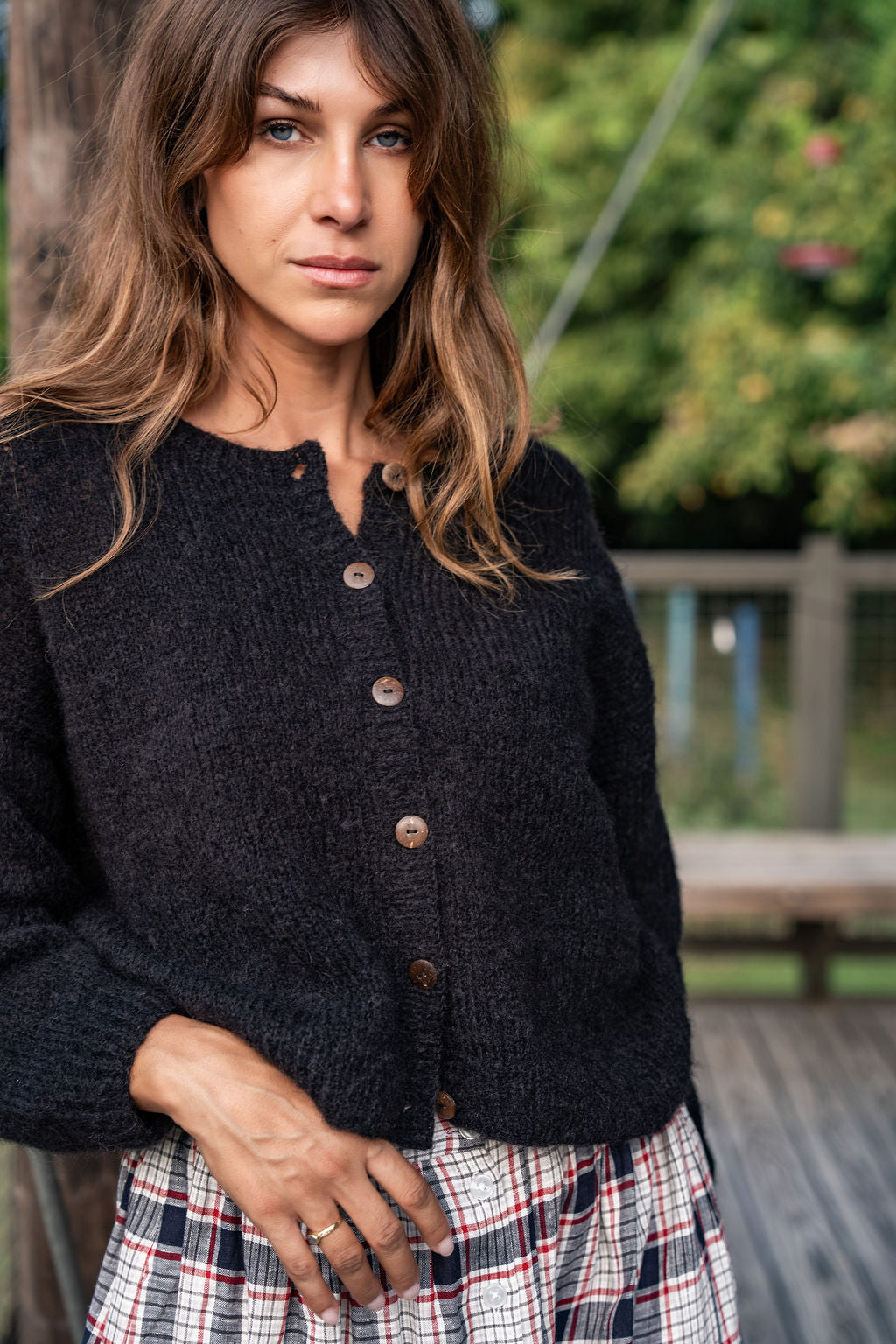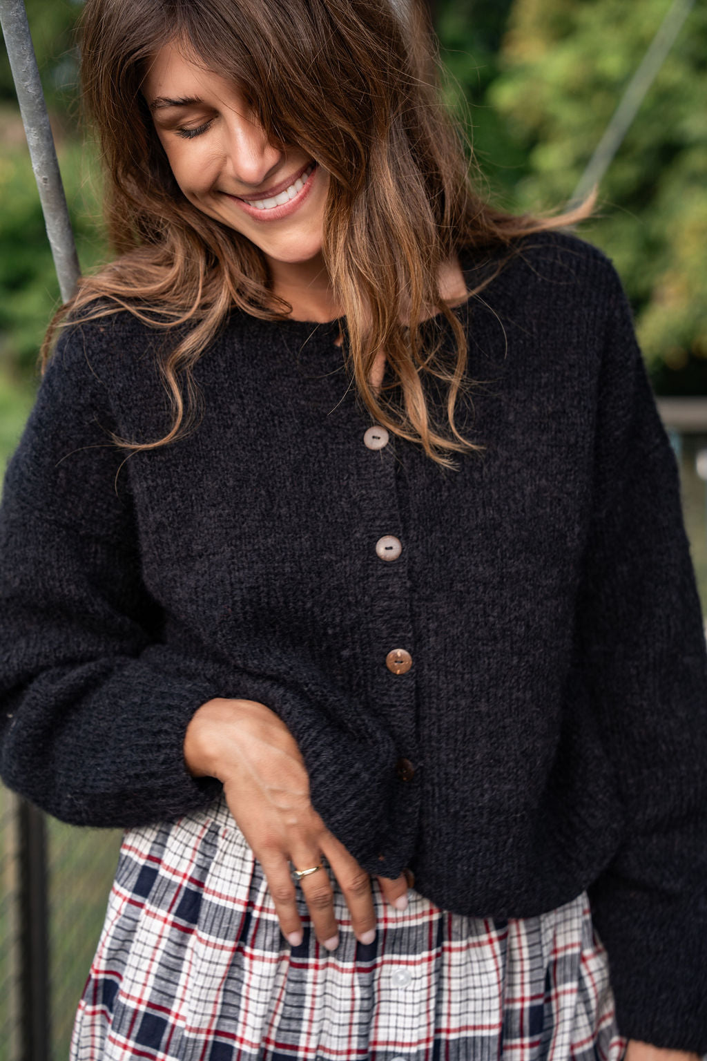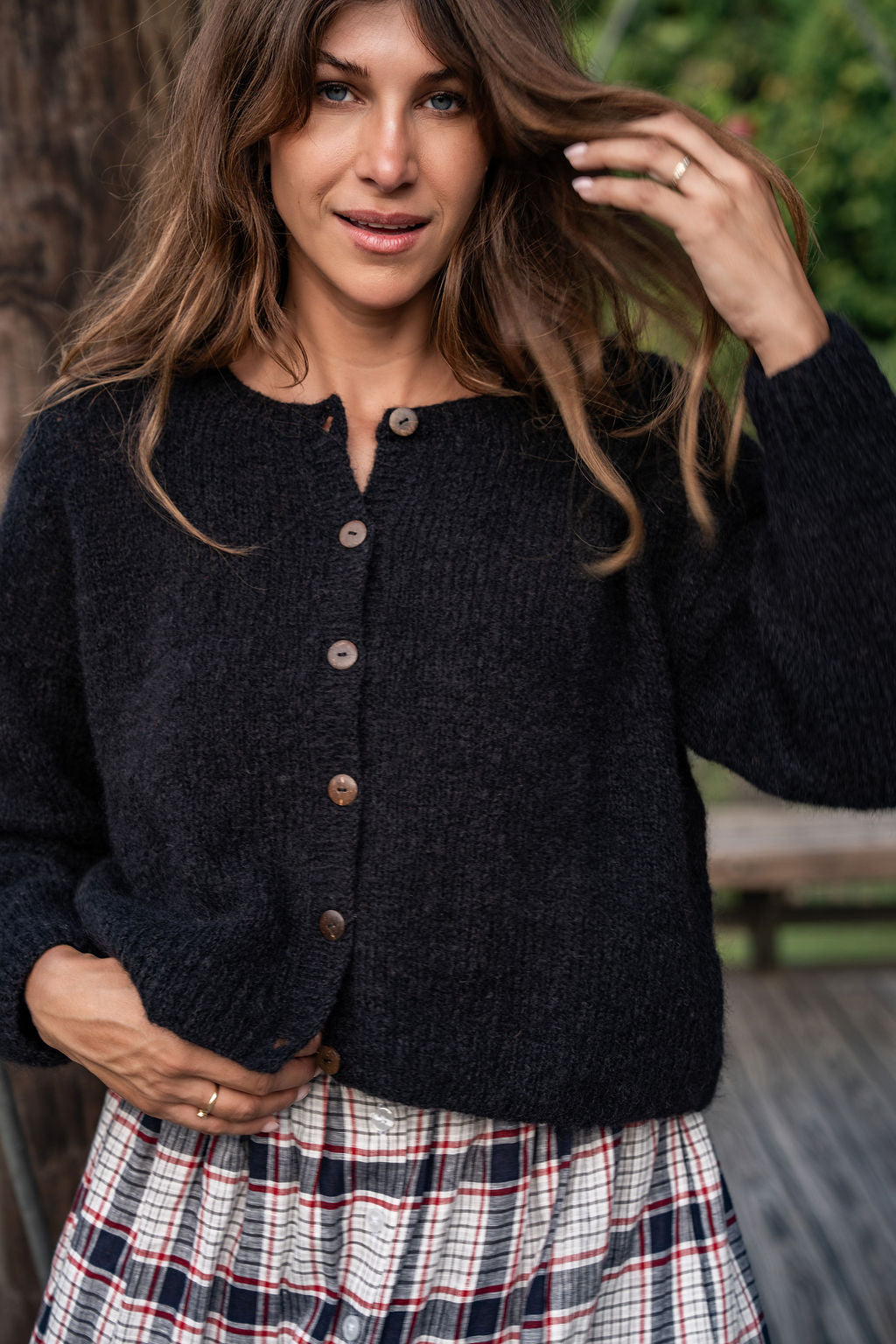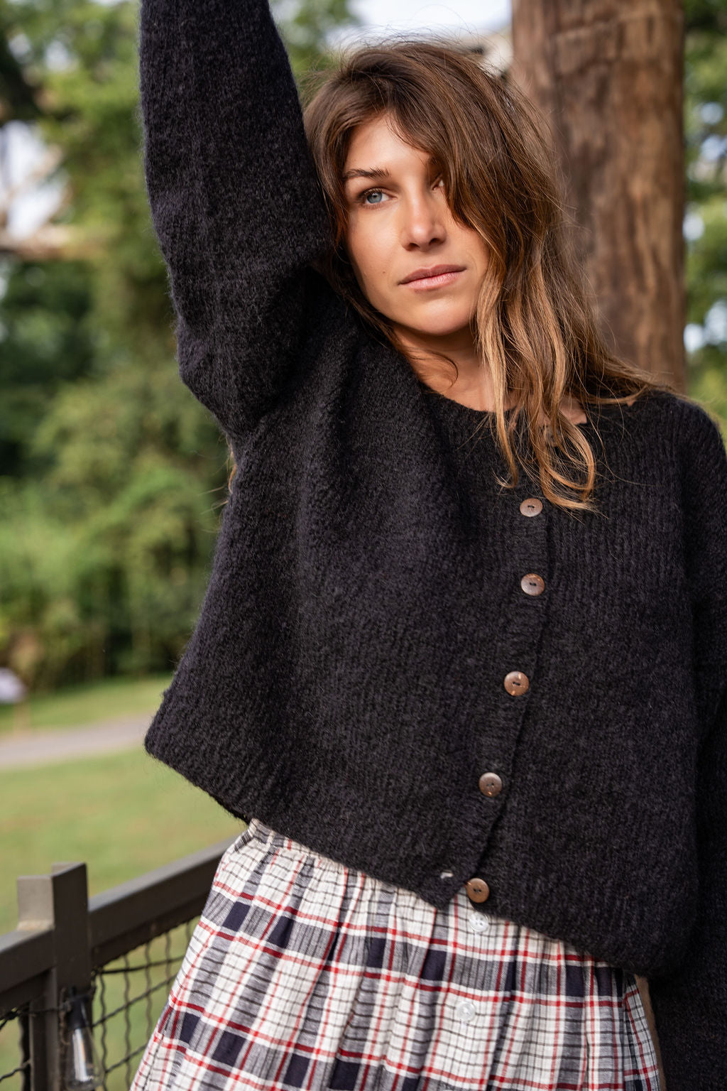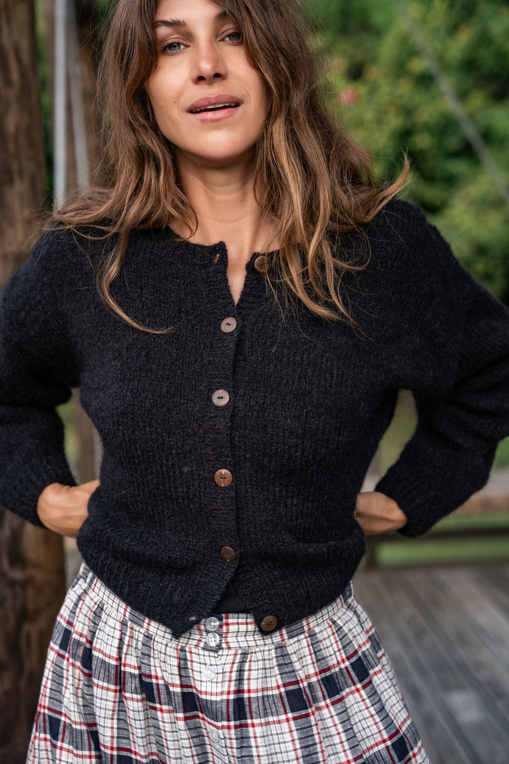 Oversized classic cardigan in a lightweight mohair with coconut buttons.