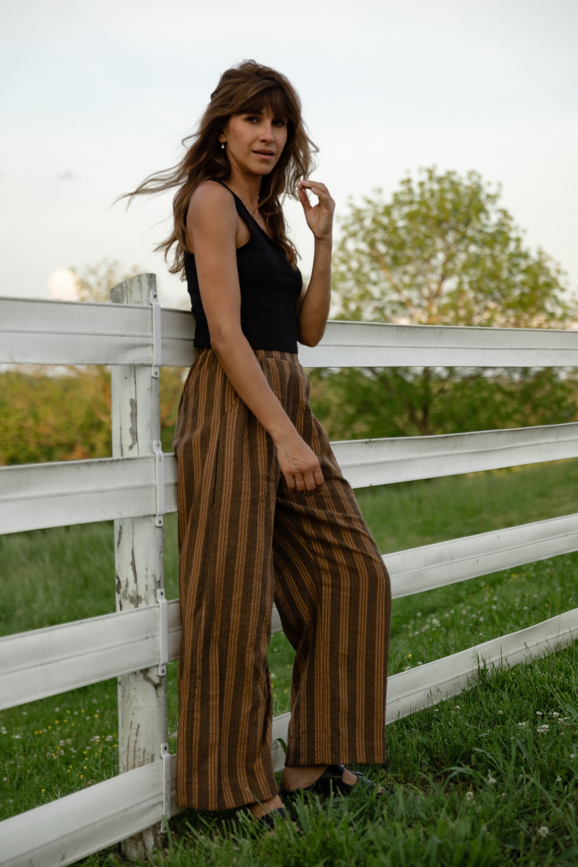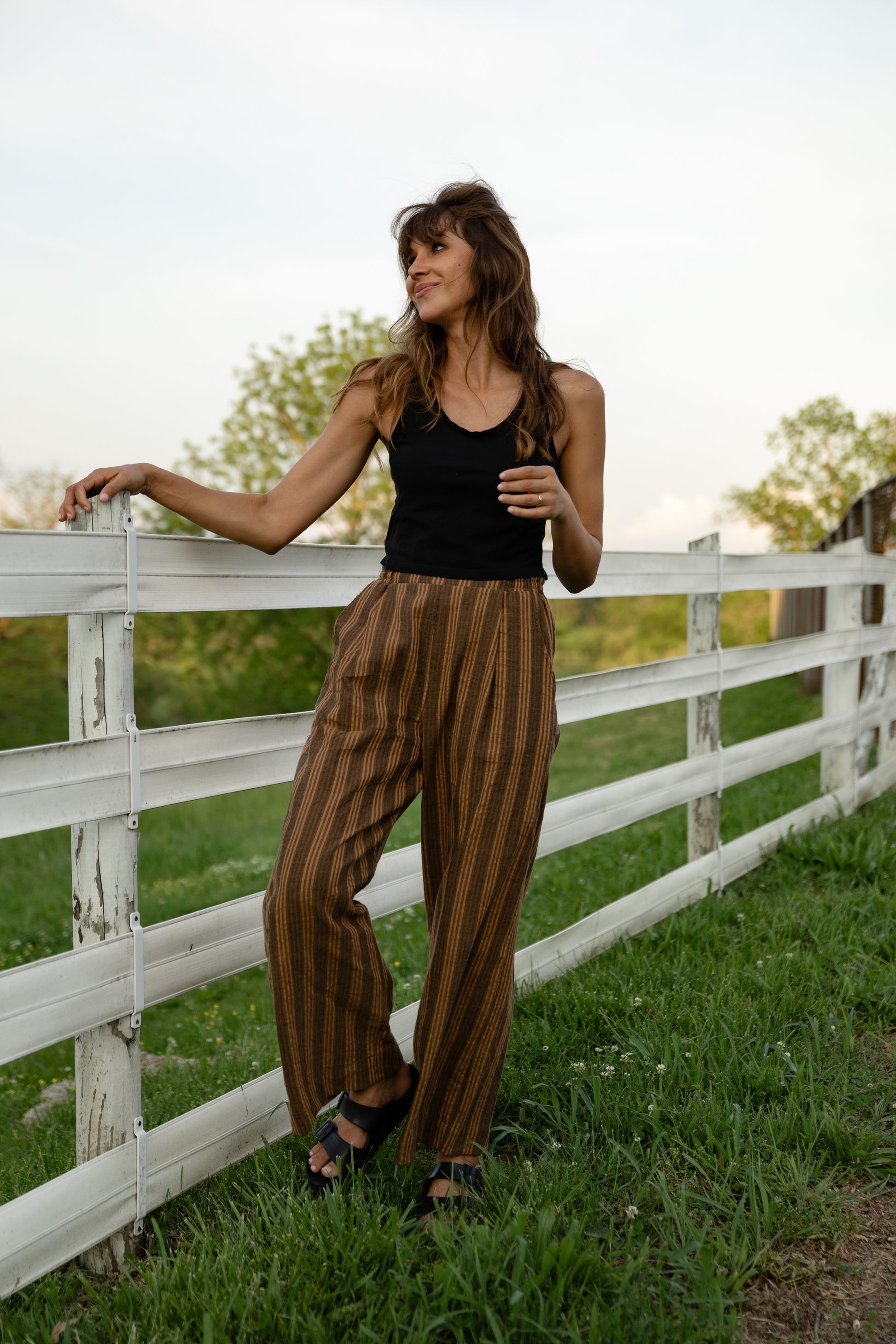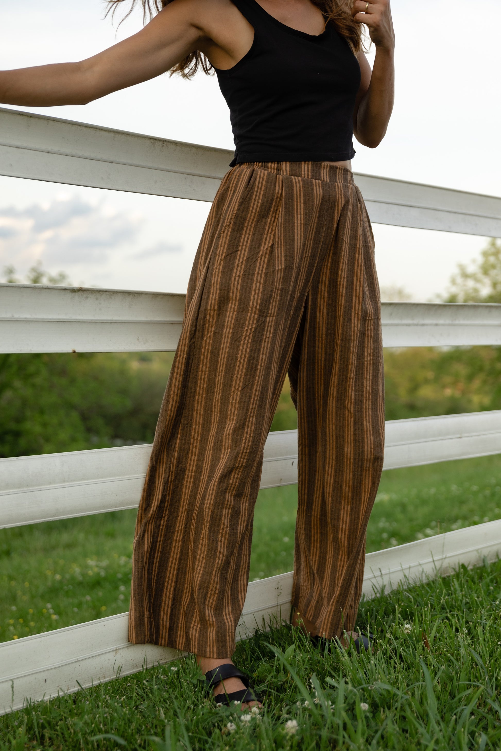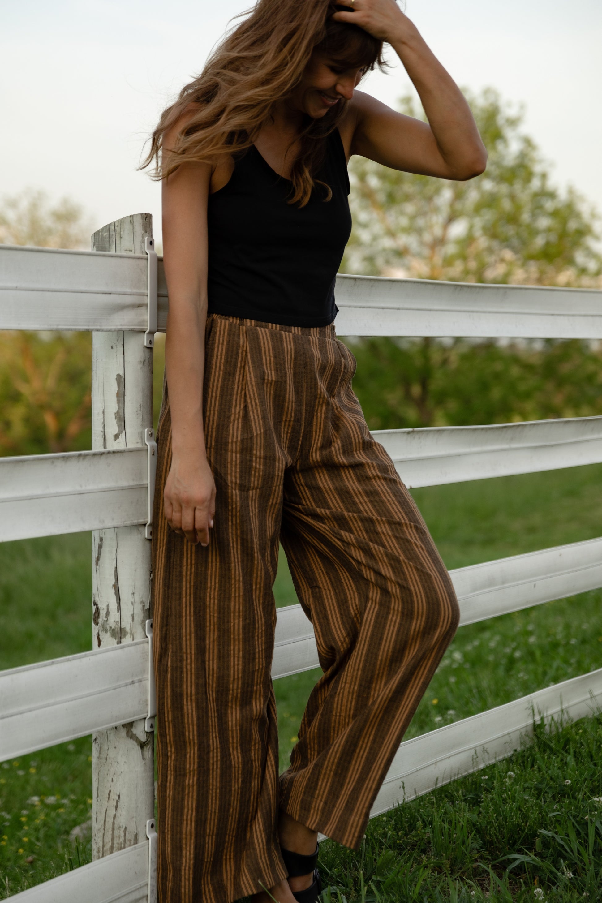Katie Handwoven Cotton Pants in Brown and Mustard Stripe Made to Order
