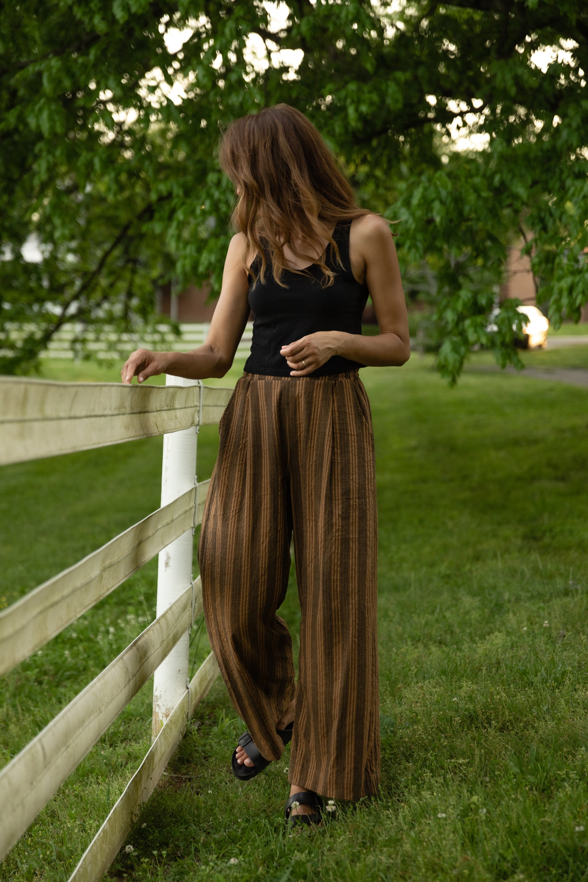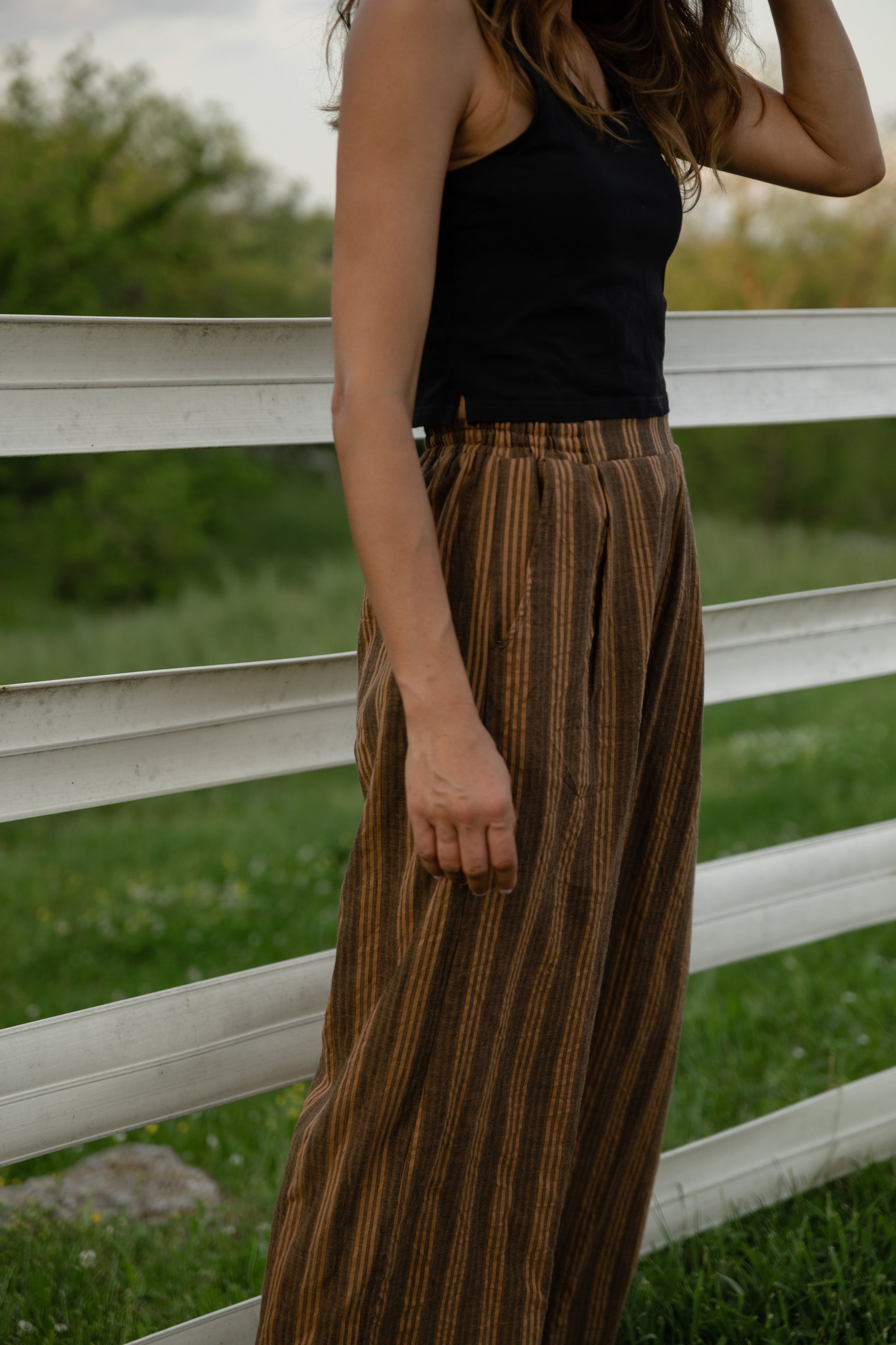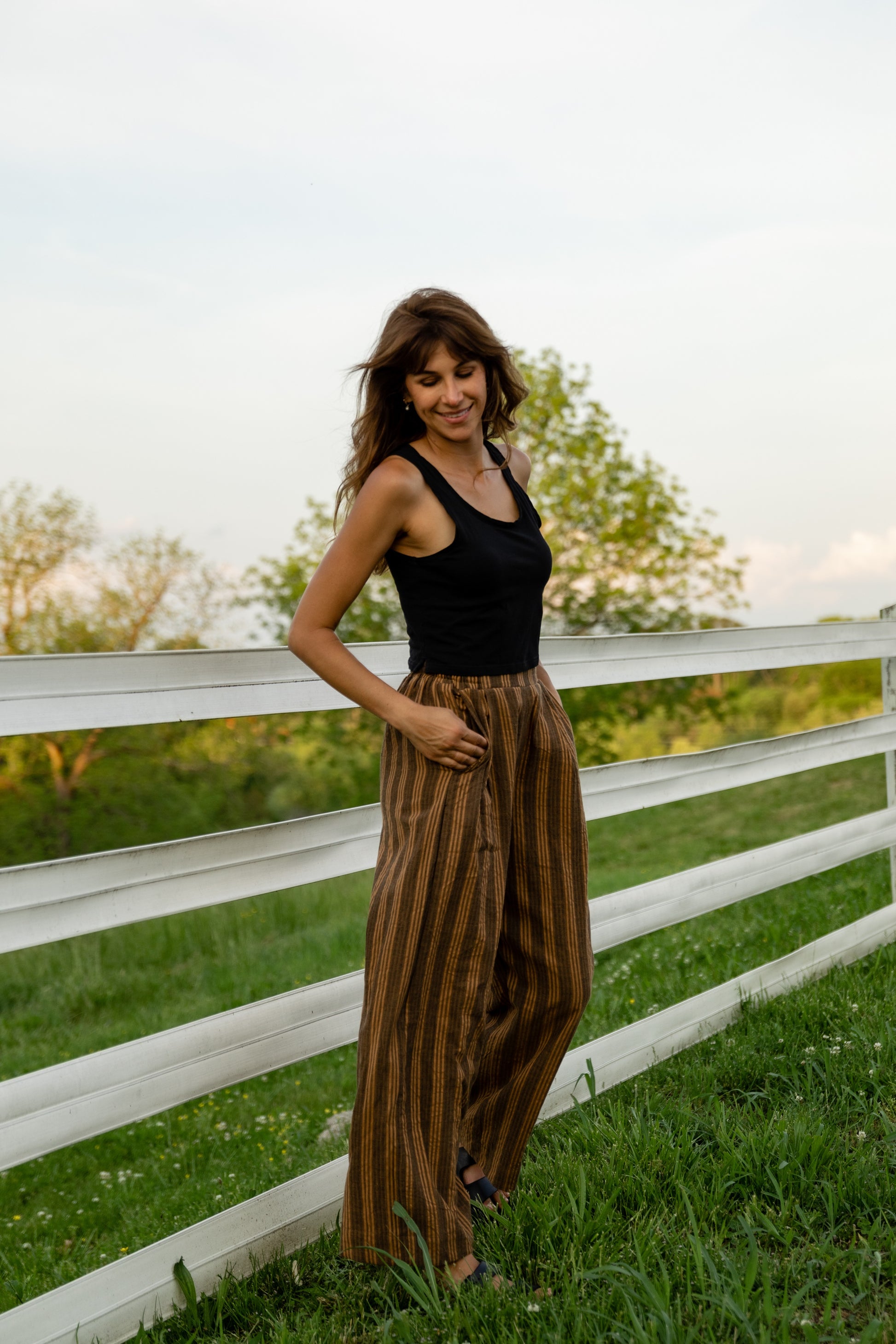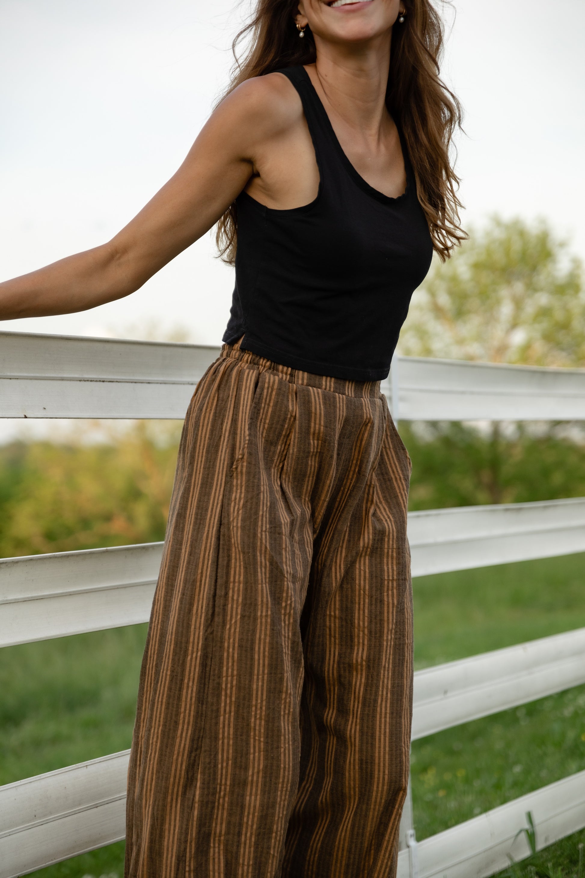 Katie Handwoven Cotton Pants in Brown and Mustard Stripe Made to Order
