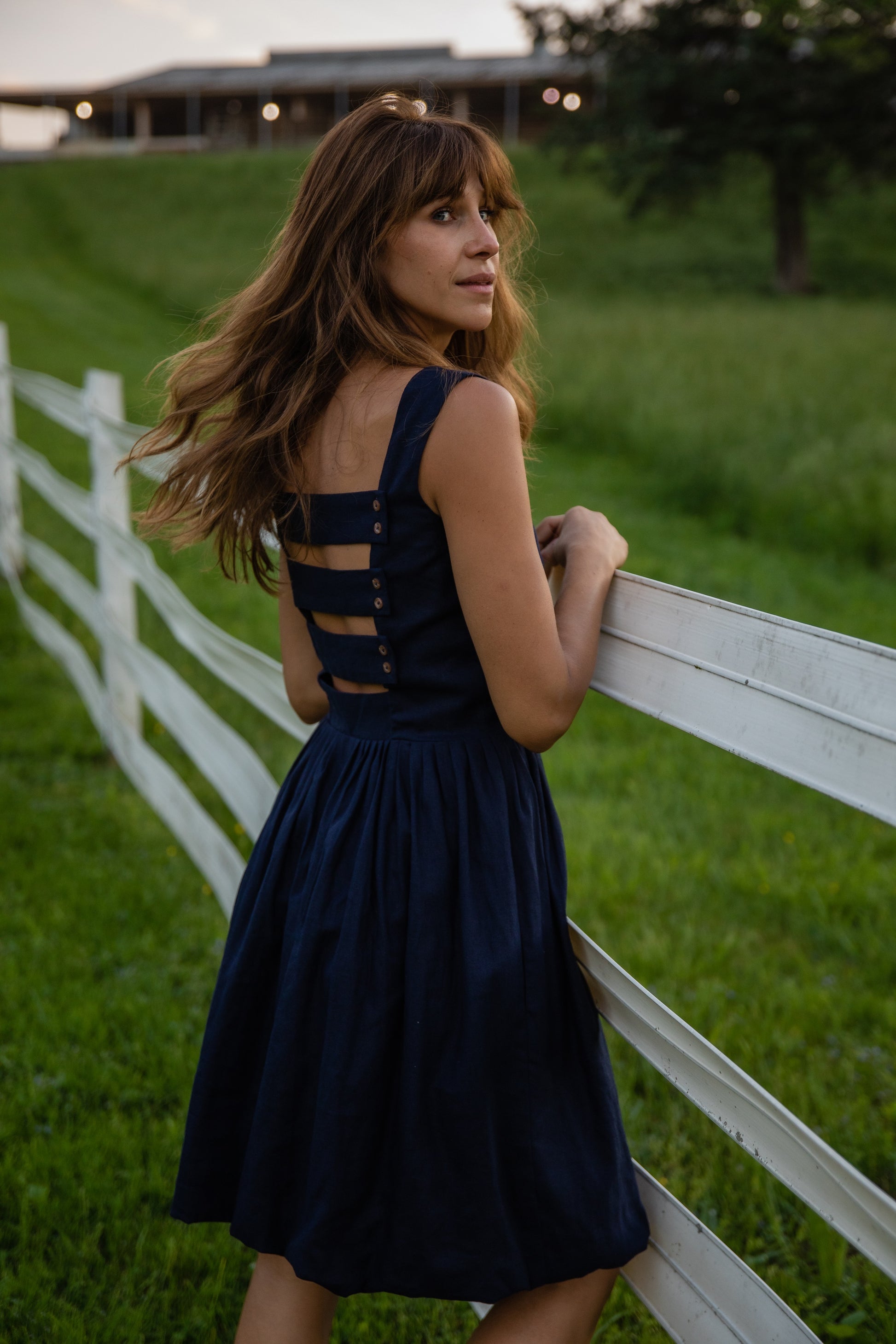 This dress is made with recycled linen and cotton deadstock fabrics leftover from large productions at nearby factories in Cambodia.