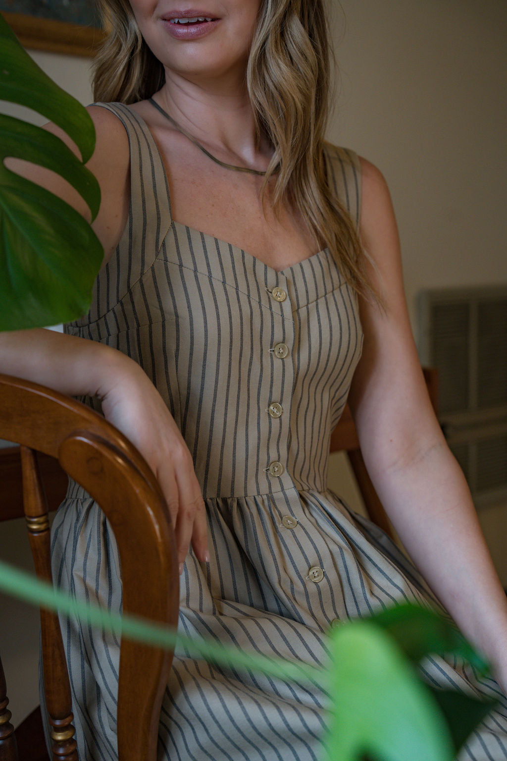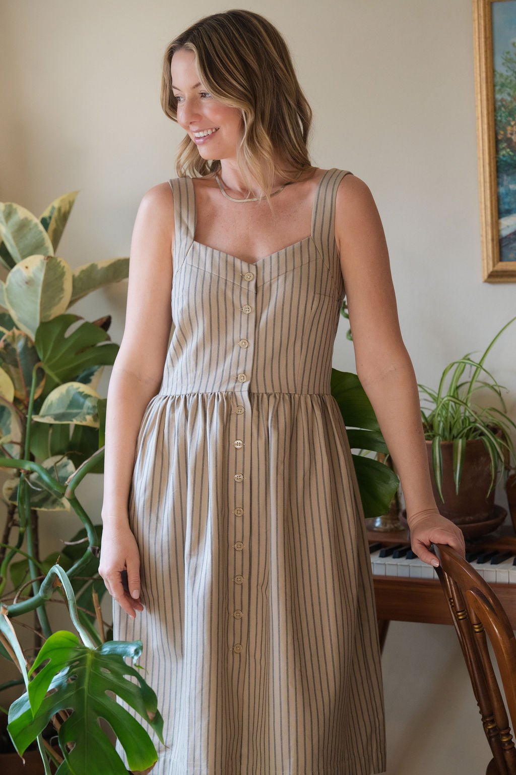 Mia Linen Dress in Tan and Black Stripe Cotton
