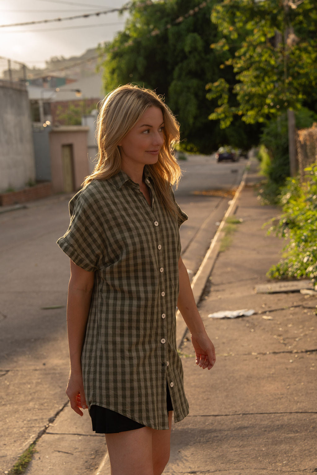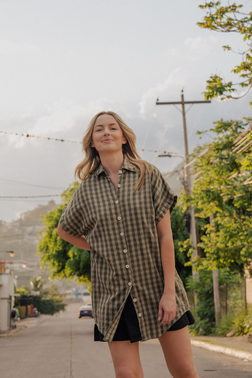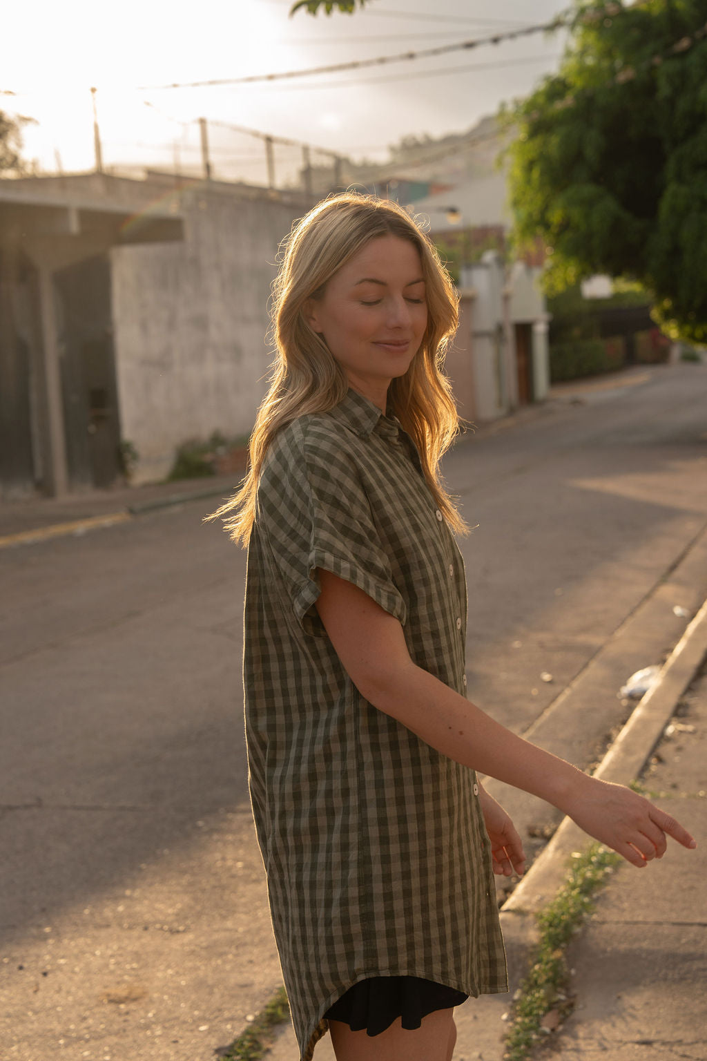 Paige Handwoven Cotton Relaxed Shirt Dress in Green Gingham - L, XL and XXL Left