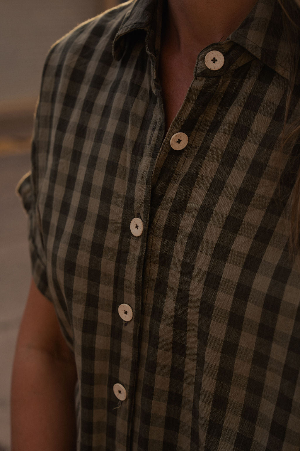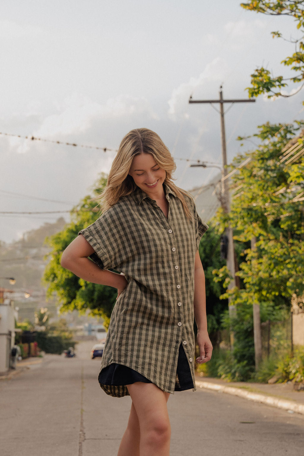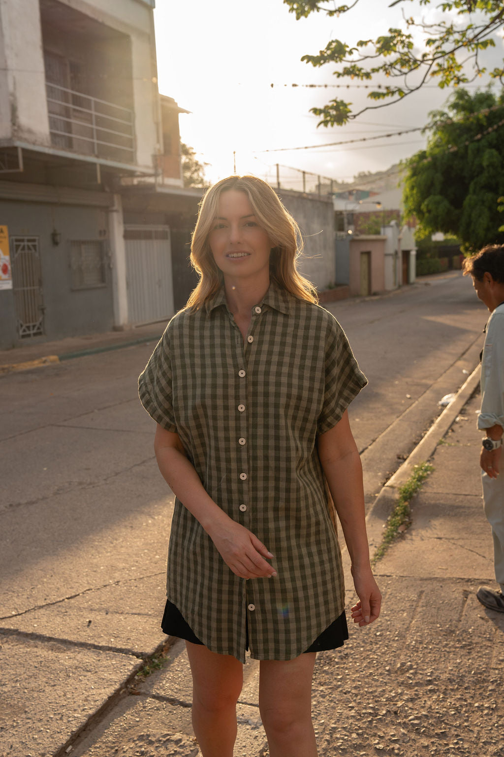 Paige Handwoven Cotton Relaxed Shirt Dress in Green Gingham - L, XL and XXL Left
