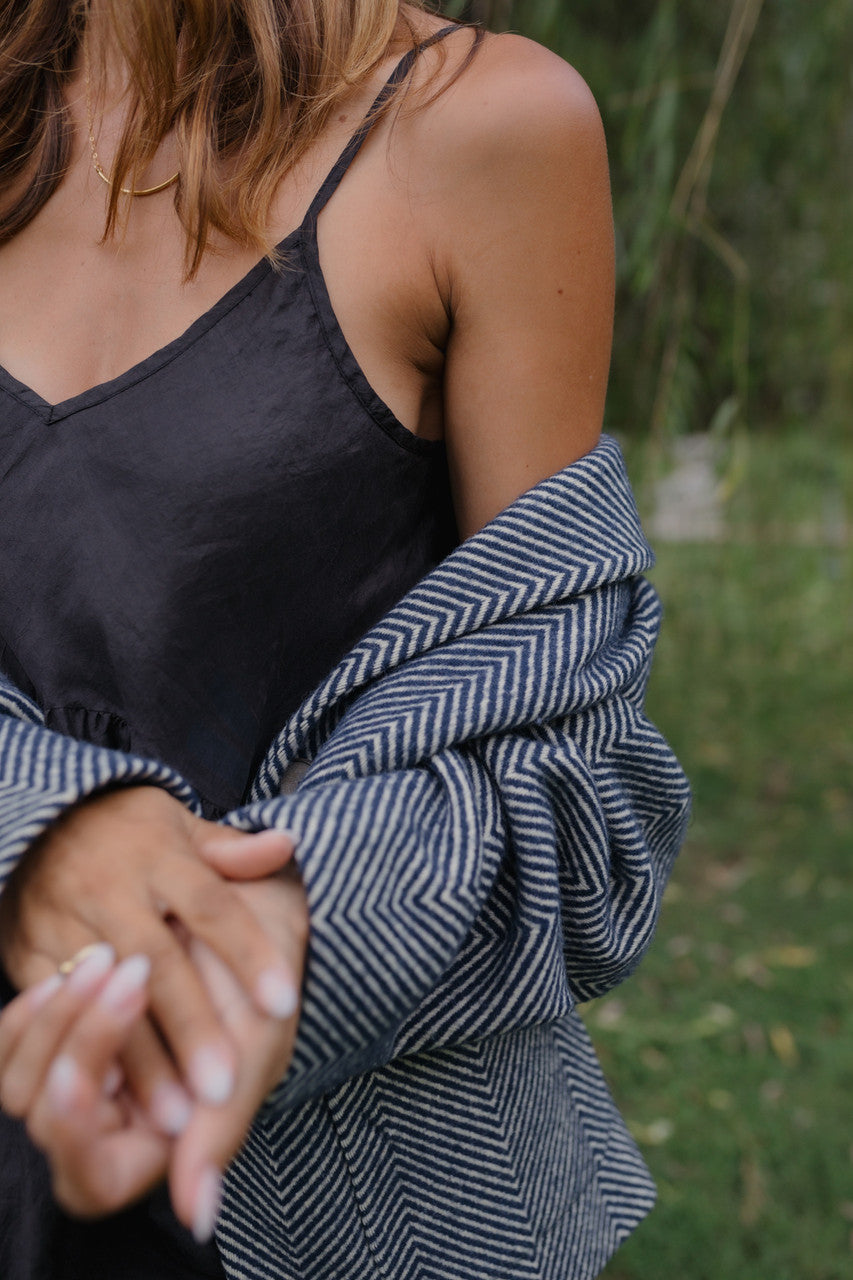 Portuguese Wool Pieper Coat in Navy and Cream Thin Herringbone Made to Order